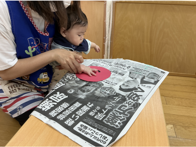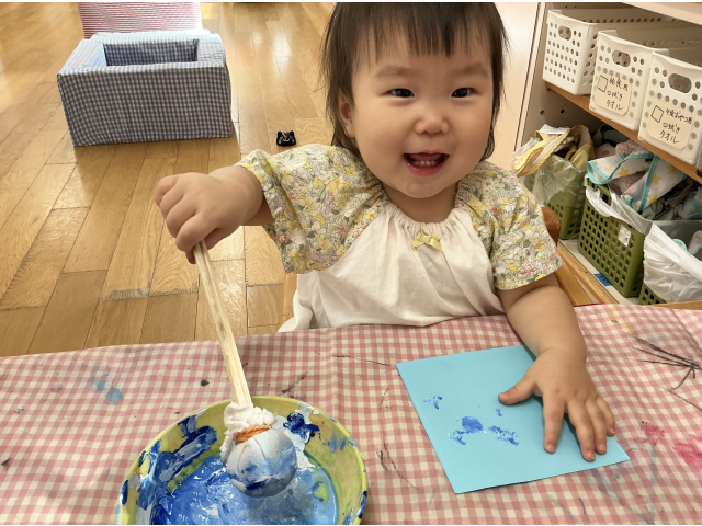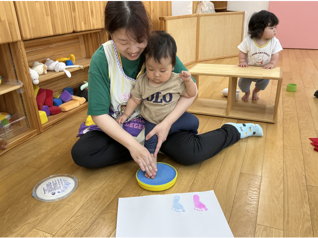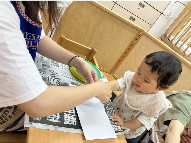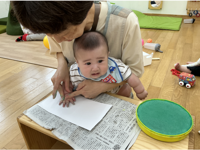 たんぽぽ組さんは、はじめての手形にドキドキ!絵の具が手につくと手を見たり握ったりして感触を楽しむ姿が見られました。