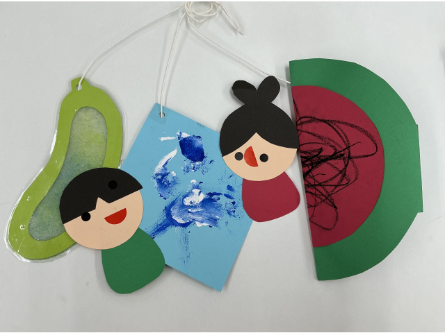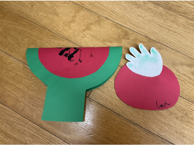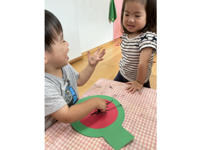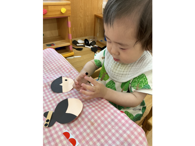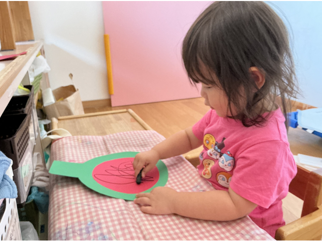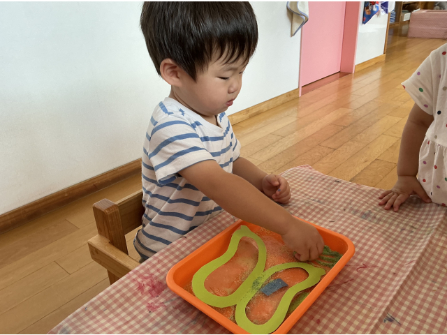 もも組さんは製作が好きな子が多く、机や椅子を出すと我先にと進んで向かい楽しんでいます!夏野菜製作のきゅうりではざらざらした塩の感触を楽しんでいました。織姫と彦星の顔はシールを貼って作りました。みんなとても集中して貼っていましたよ。素敵なお顔が完成しました!