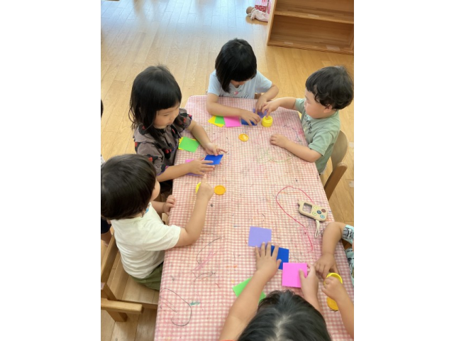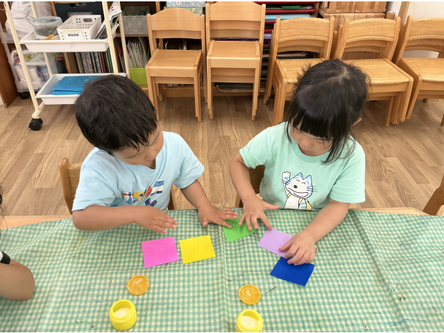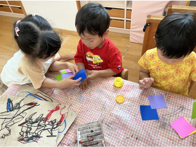 2~5歳児のたてわり活動で7月の七夕飾りに使う「五色つなぎ」をペアのお友だちと一緒に作りました!