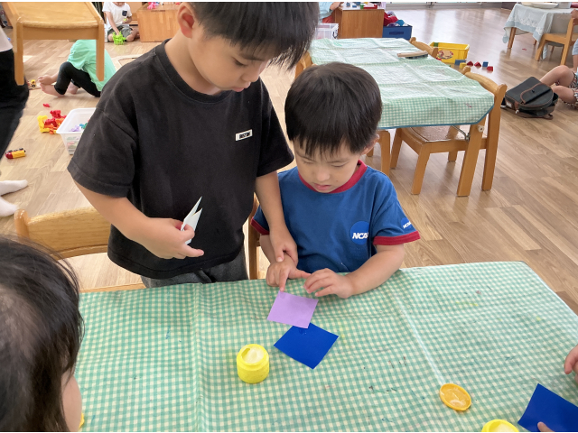 年長さんが2歳児さんにのりをつける場所や貼る場所を教え、3歳児,4歳児さんは一緒に楽しみながら作っていました!