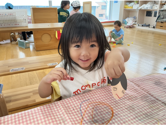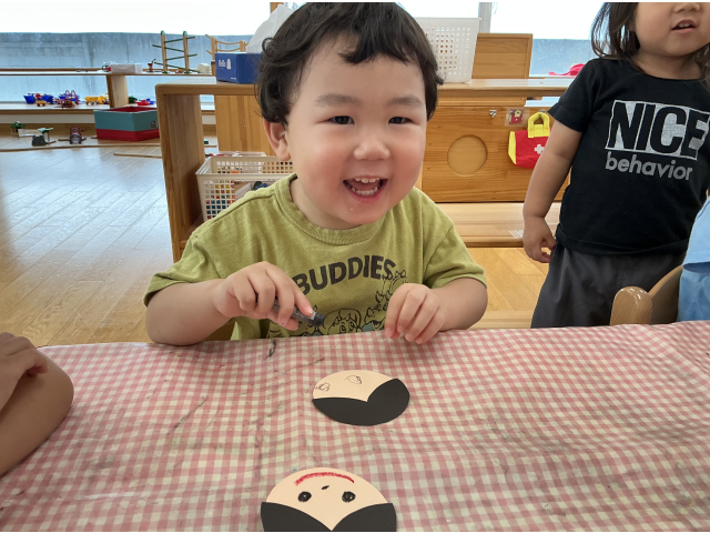 2歳児さんはどんなお顔にしようかな~?と考えながら織姫様,彦星様の顔をクレヨンで描いていきます!ニコニコ笑顔のお顔が完成すると「みて~!」と嬉しそうにみせています!