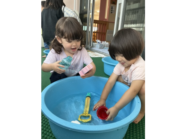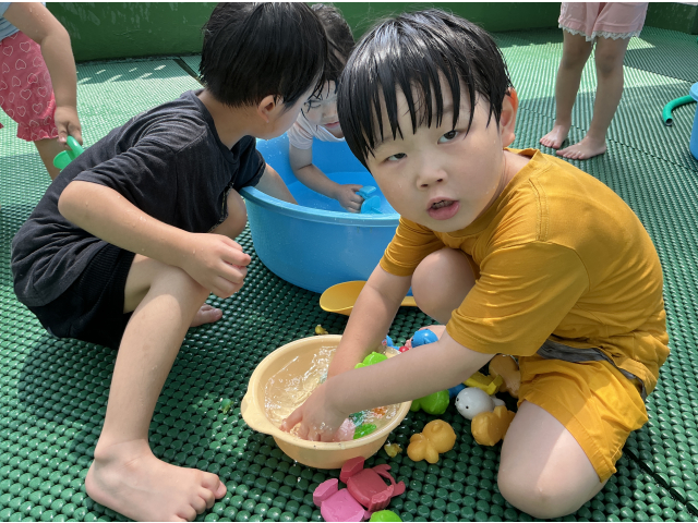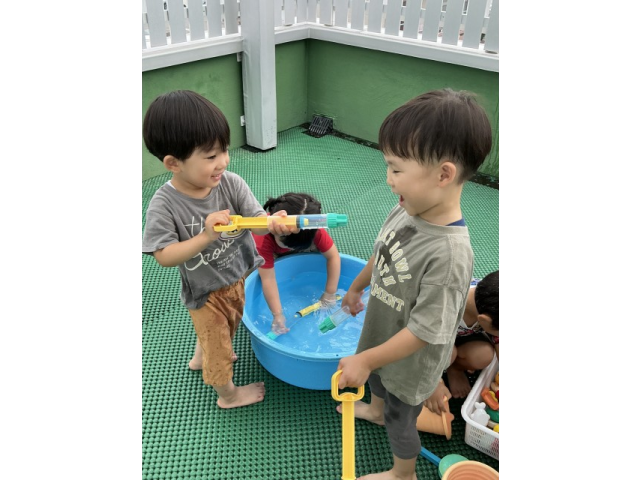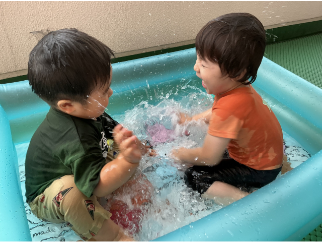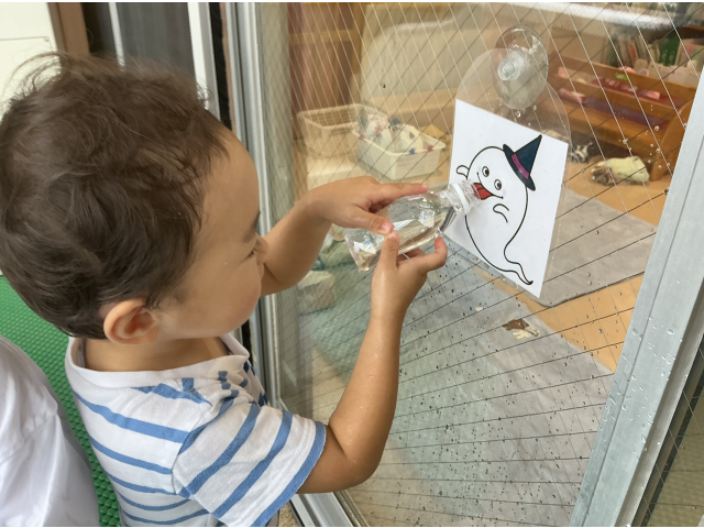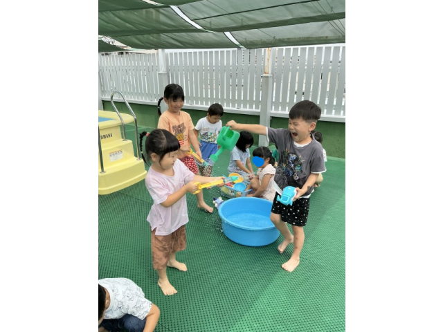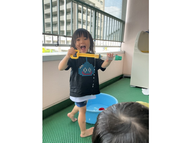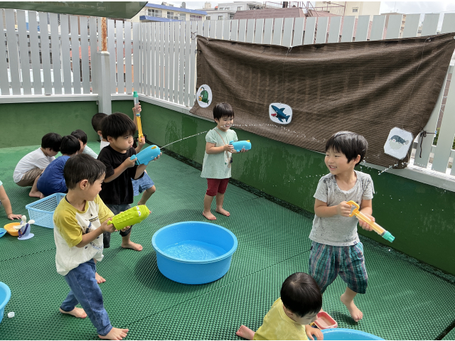 2歳児さんは水遊びが好きな子が多く、「今日は水遊びする~?」「やった~!」と毎日楽しみにしています!水を掛け合ったり、ペットボトルに水を入れ壁に貼ってあるイラストに「ジュースどうぞ~」とあげたり楽しそうな子ども達!幼児さんは、水鉄砲を使って的当てゲーム!距離が遠くても狙いを定めて的に当てています!ミストを出すと自ら水を浴びに来る子もいました!