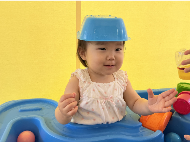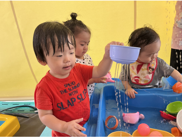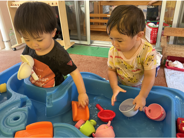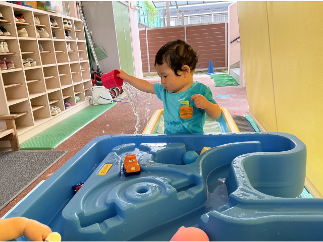 友だちや保育者が水で遊ぶ姿を見ながら少しづつ興味を持って触れるようになり、今では水遊びを積極的に楽しんでいます♬