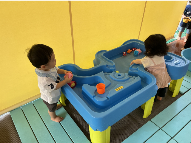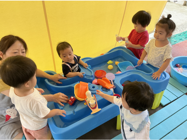 0,1歳児さんは大きい水遊び用の遊具とたらいで水遊びをしています。
