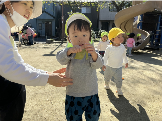 園庭より広い公園でたくさん身体を動かしたり、葉っぱなどを見つけて楽しめました。また散歩に行こうね!