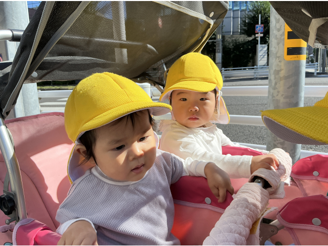 緑色の帽子の一歳児さんは手をつないで歩いていきます。