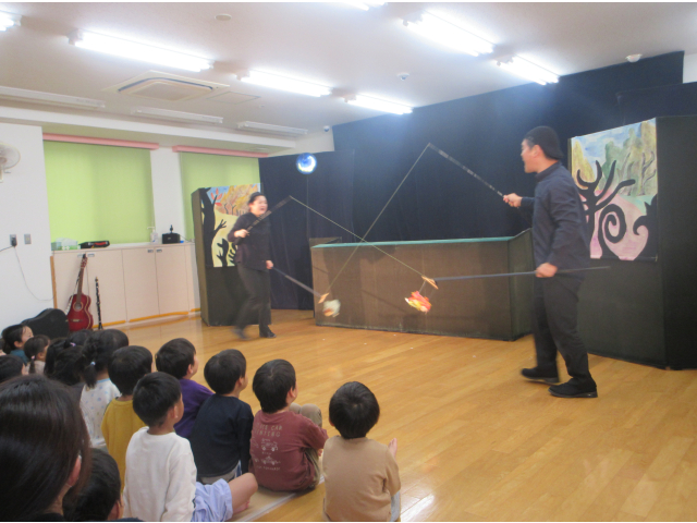 たんぽぽ組は、先生のお膝の上で一緒に楽しみました。人形の動きを目で追い、笑って喜ぶ子もいました。もも組は、音楽に合わせて体を揺らしたり、指差しをして知っている動物が出てくると嬉しさのあまり立ち上がる子もいました。