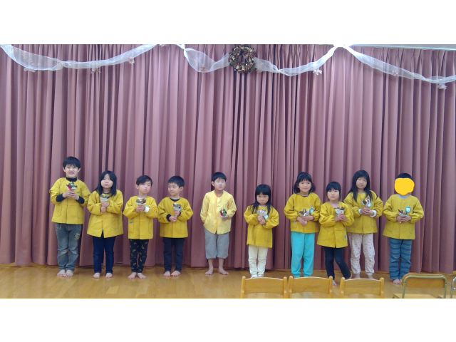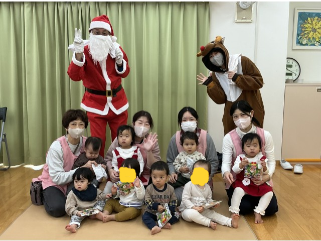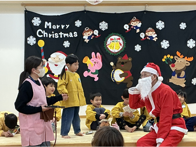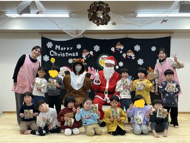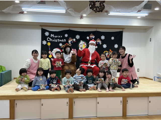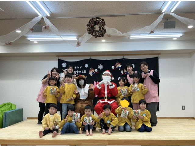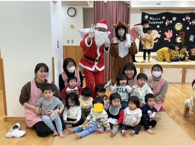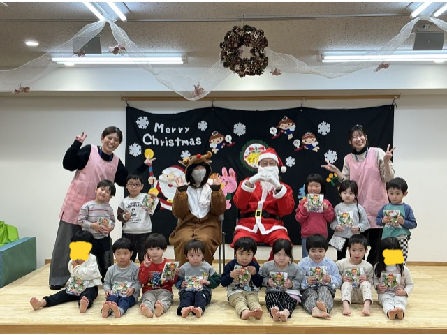 鈴の音が鳴り、待ちに待ったサンタさんが登場!今年はトナカイさんも来てくれました。プレゼントを一人ずつ貰い各クラス、サンタさんと写真を撮りました!