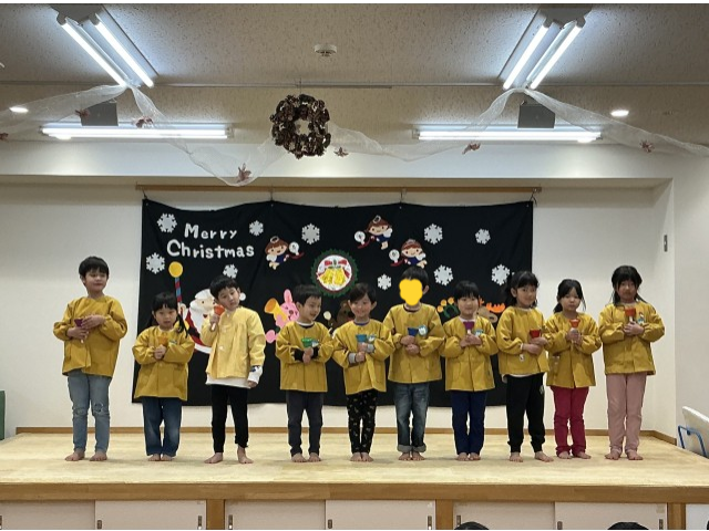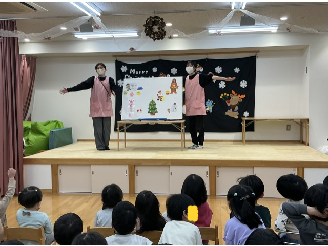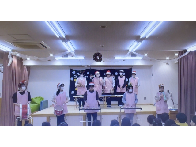その後は先生たちによるクリスマスのお話のパネルシアター、器楽合奏(夢をかなえてドラえもん)、ミュージックベル(we wish you a merry chritmas)を楽しみました。パネルシアターではサンタさんが色々なお家にプレゼントをが届くのかとワクワクして見ていました。