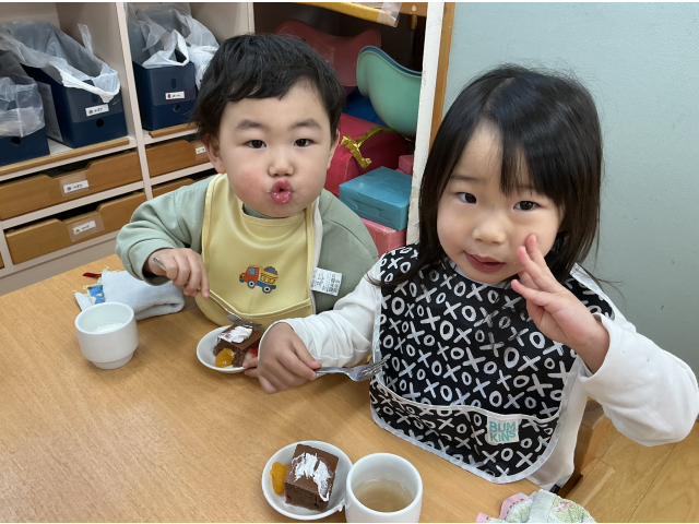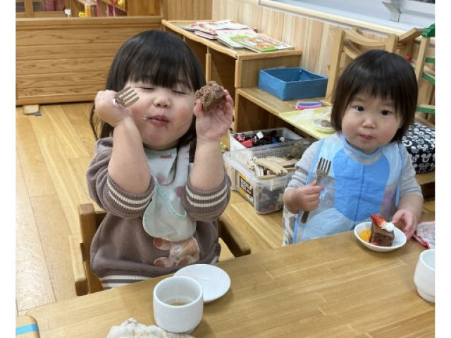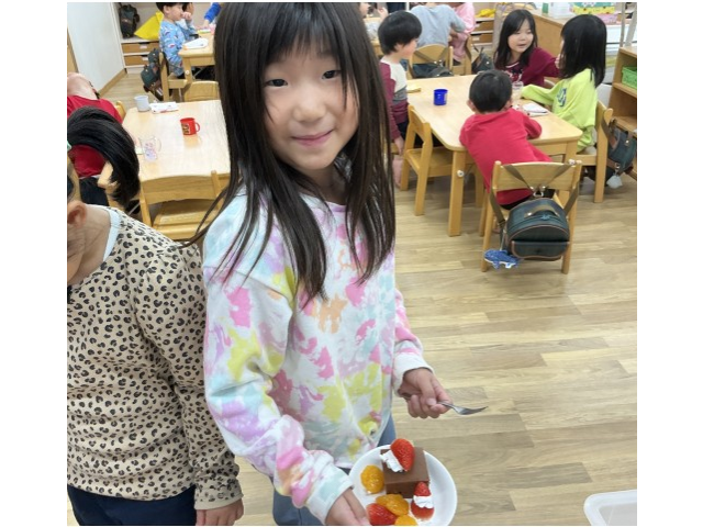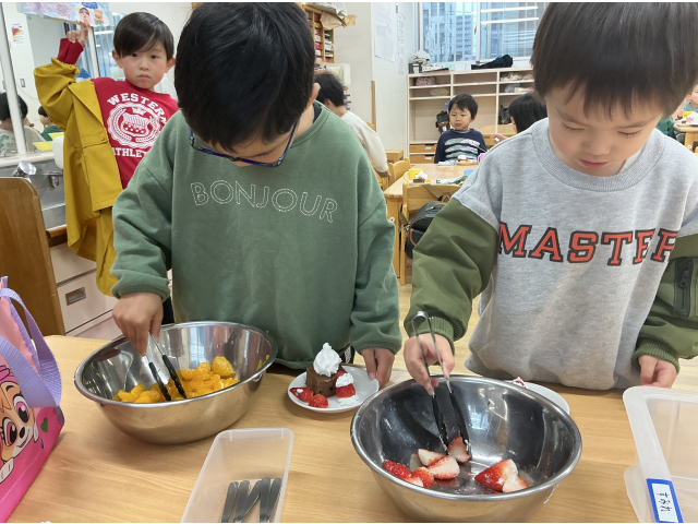 “生クリームいっぱいにする!”“いちごとみかんものせちゃう~♪”と思い思いにケーキを作っていました!