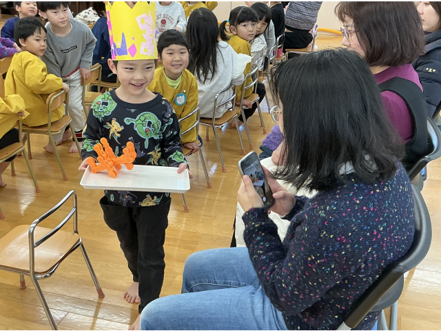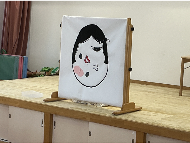 保育者の出し物では、「お餅を焼いたとさ」の簡単なシアターを見ました。いろいろな動物がお餅を焼きにきて、うさぎやおさるの登場に真剣に見つめていました。お餅の形がおばけになるとびっくりした様子のみんな、最後まで楽しんで見ました♪