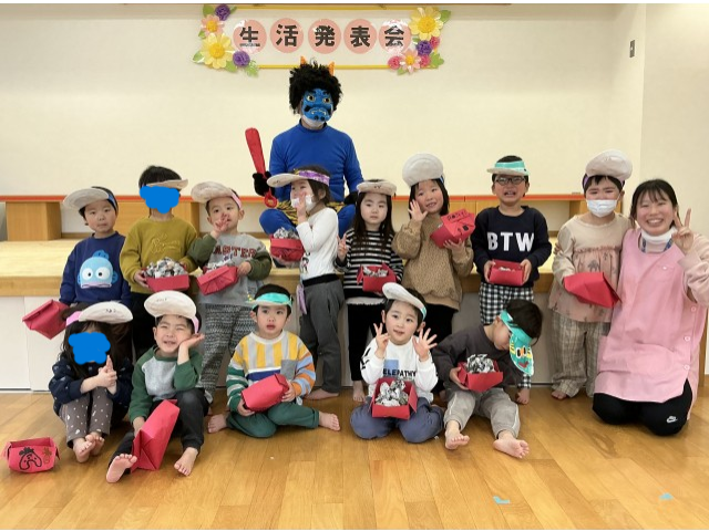 そんな2月3日は節分の日。2~5歳さんは事前に作った鬼のお面と枡を使用し、豆まき会が行われました。初めに、節分の由来やなぜ鬼は豆が嫌いなのかという話をみんなへ伝えていきました。