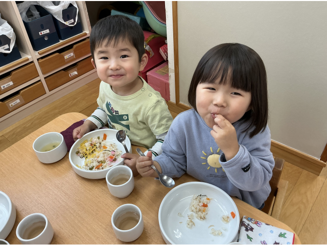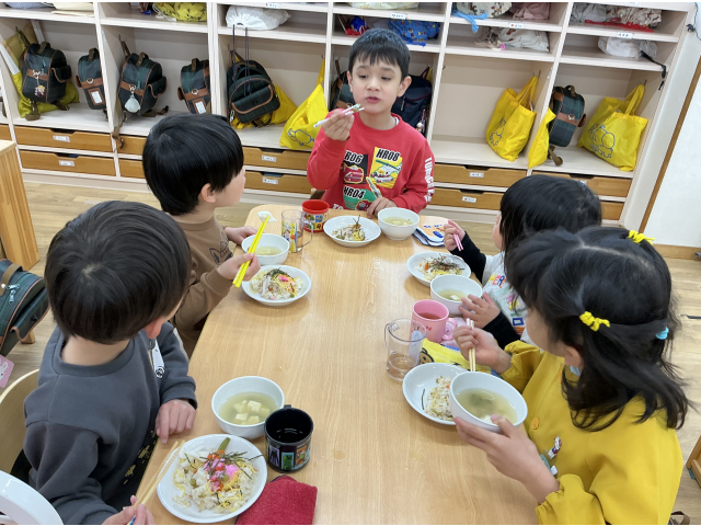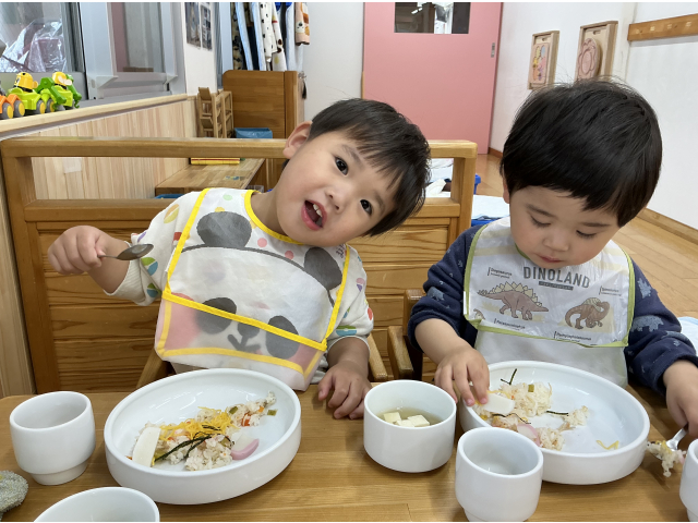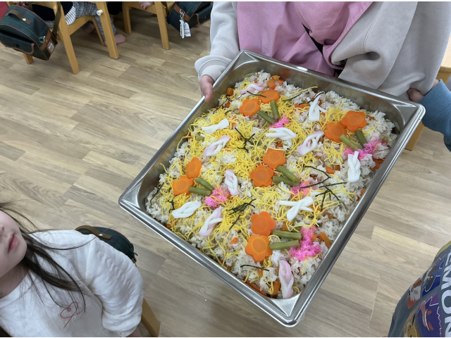 ちらし寿司の中には“何が入ってるの~?”ご飯の上にのせた「錦糸卵」や「桜でんぶ」を見て“これはなに~?”と質問する子もいました!