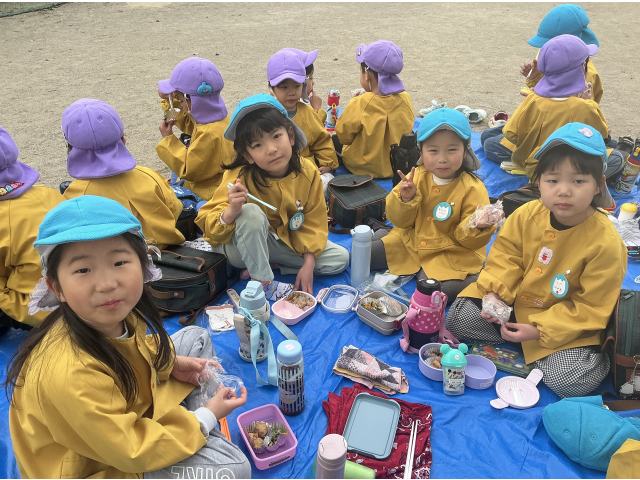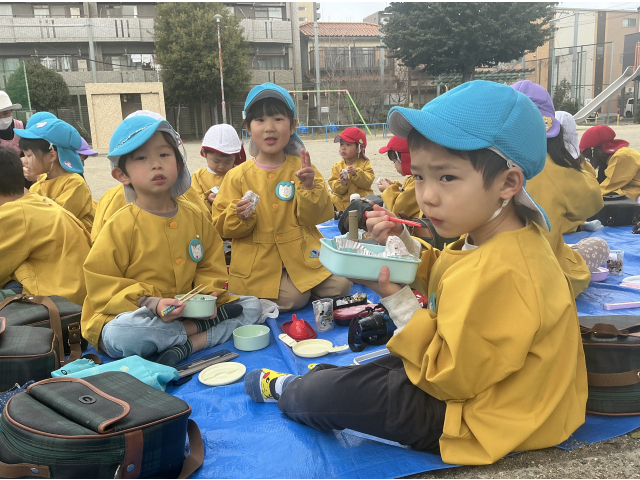 たくさん遊んだ後は自分のお弁当箱に入れた給食をみんなでいただきました。