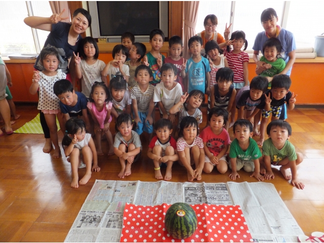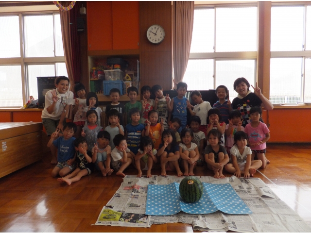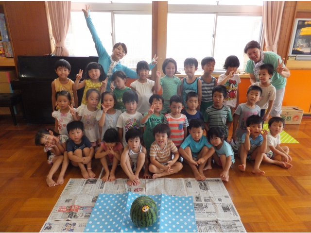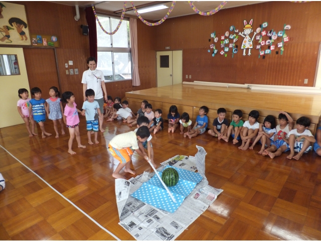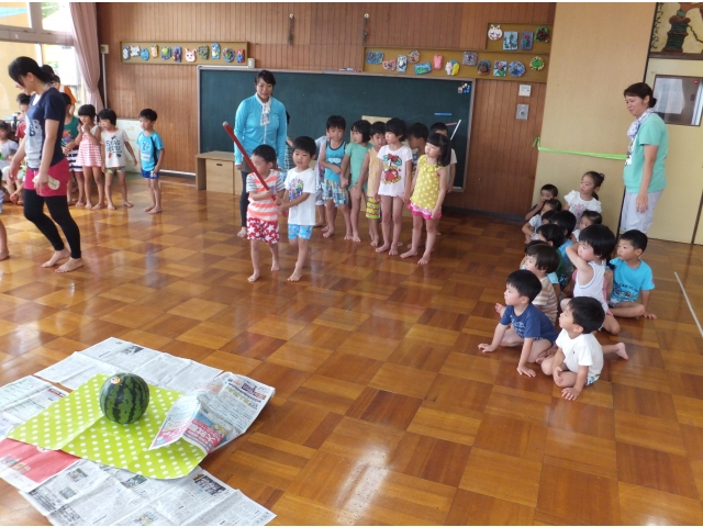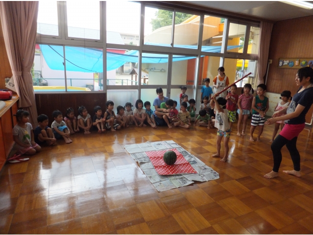 棒をスイカに当てることが難しかったけれど、最後は年長さんが力いっぱい棒を振り見事に命中\(^o^)/