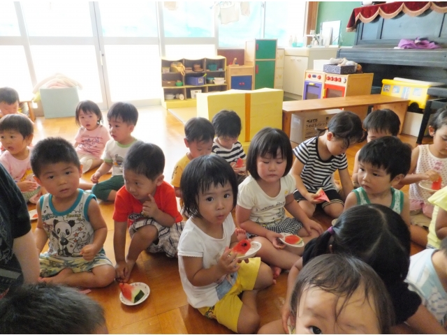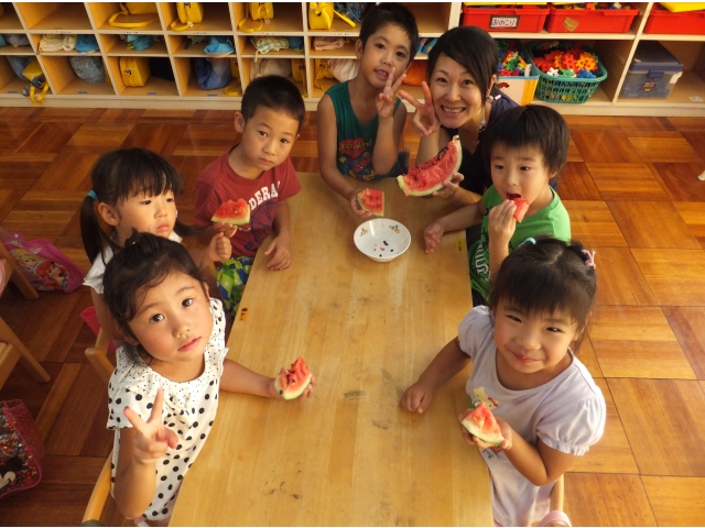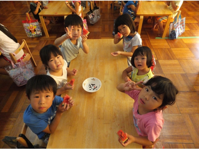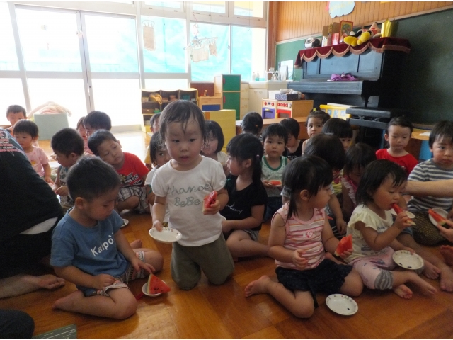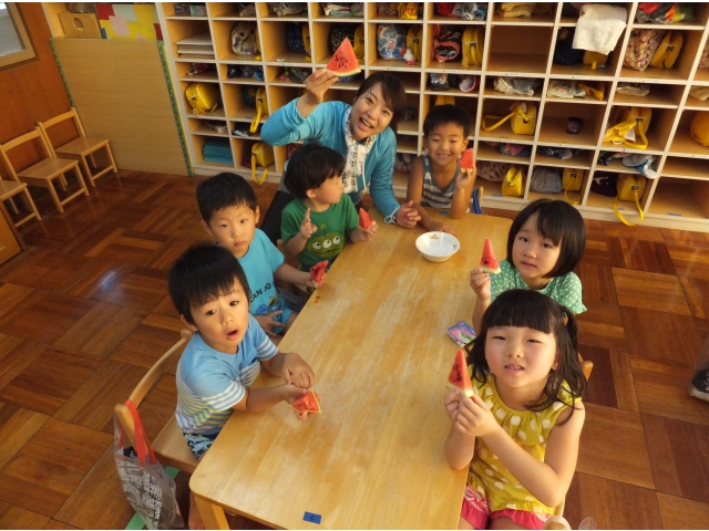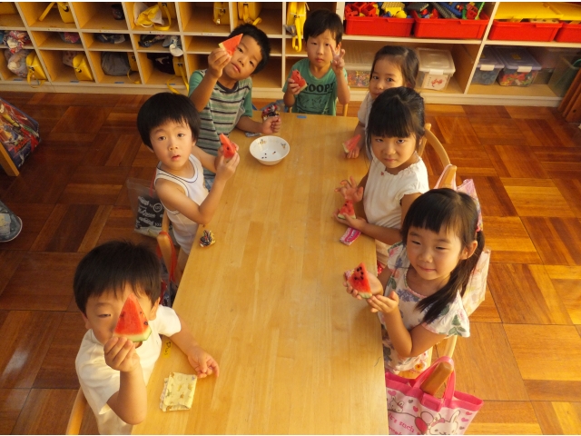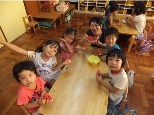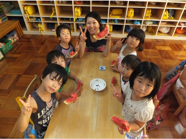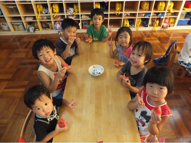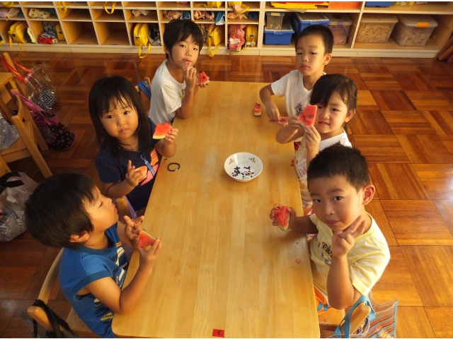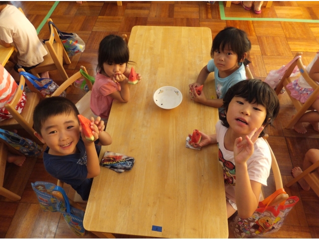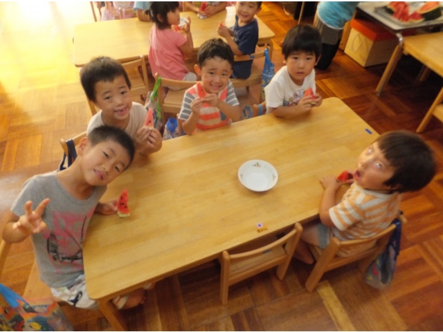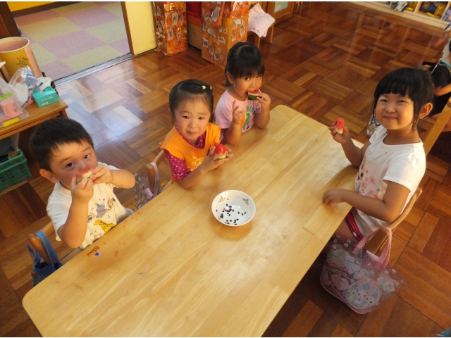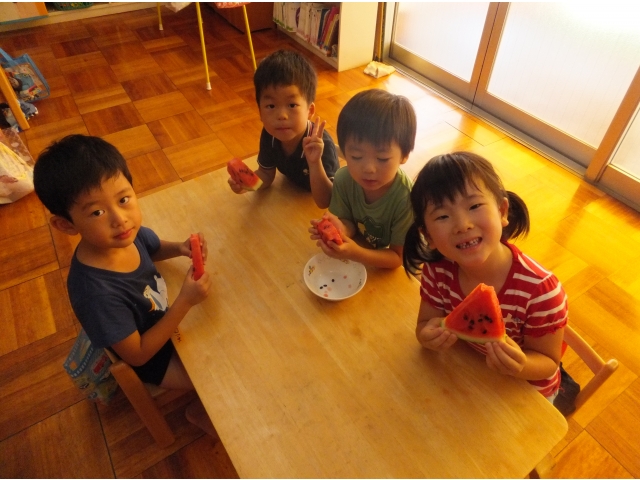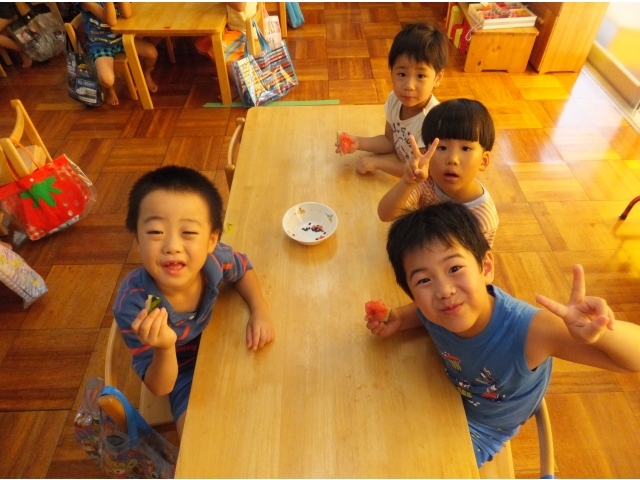 皆で割ったスイカは格別に美味しかったようで、嬉しそうに頬張っていました(8分音符)