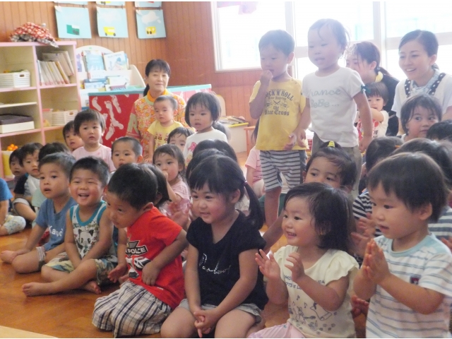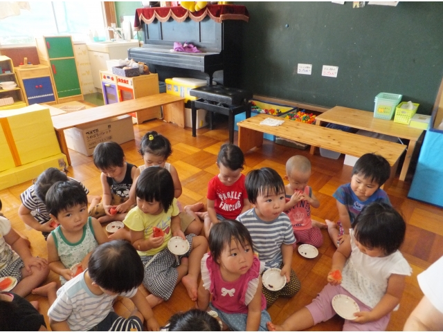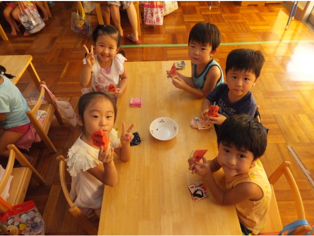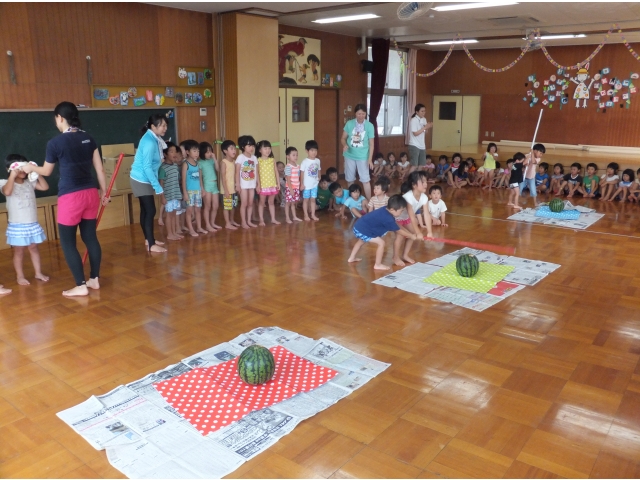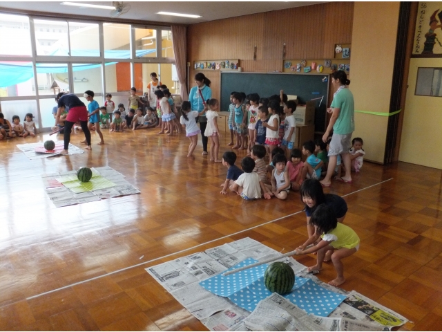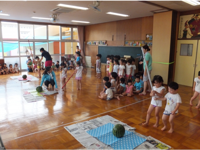昭和荘保育園では8月は3~5歳児の縦割りクラスで過ごしています。縦割り3クラスに分かれてスイカ割りをしました♪