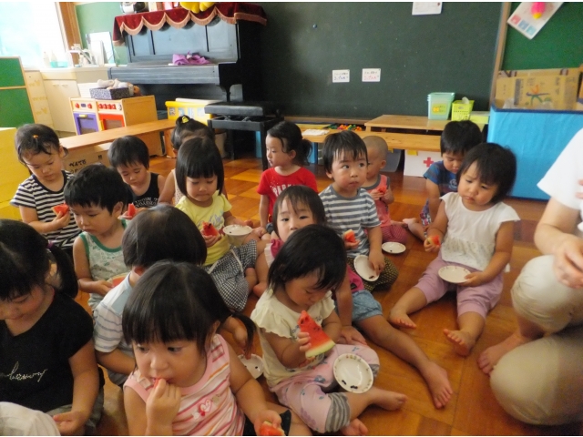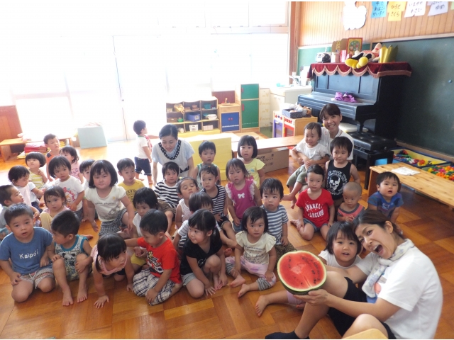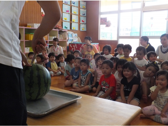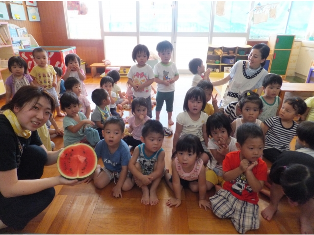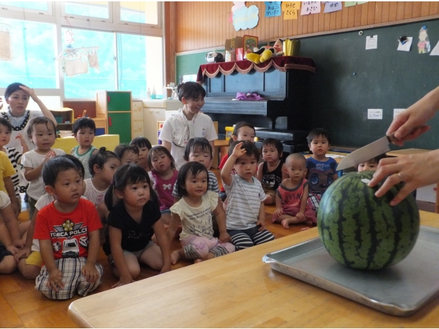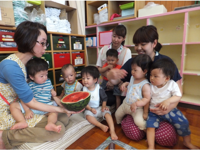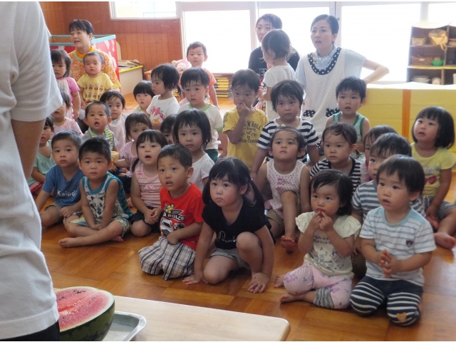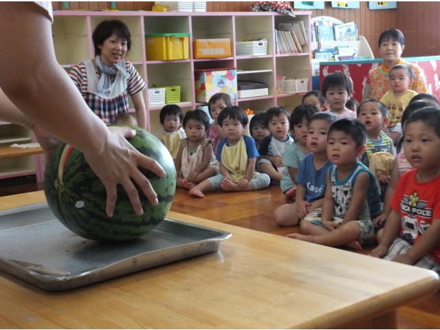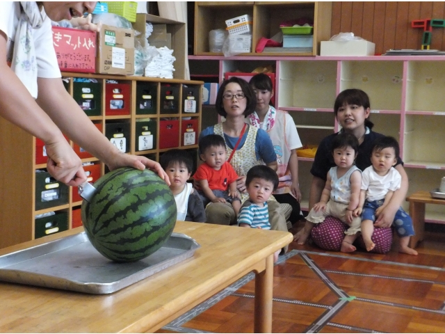 0~2歳児クラスも合同でスイカに触ったり、叩いた音を聞いたりしました。