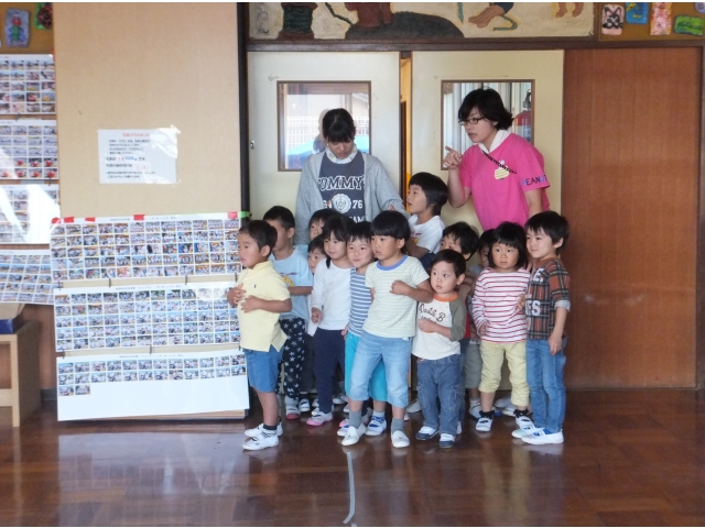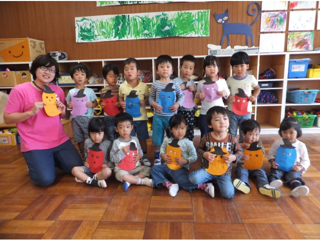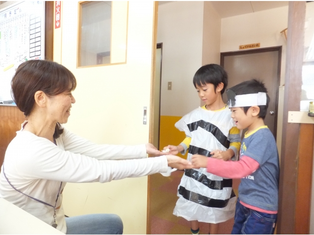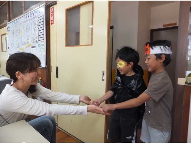 事務所に行き、元気よく「トリックオアトリート(8分音符)」といい園長先生にラムネをもらい大満足な子どもたちでした(8分音符)(*^▽^*)