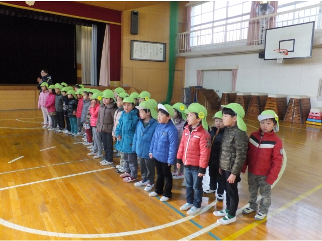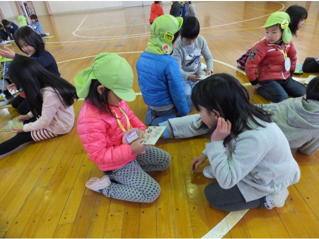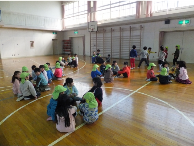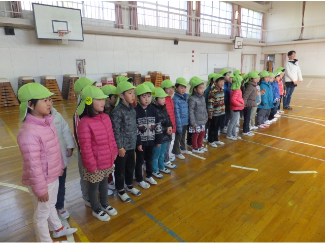 伊勝小学校の1年生に招待され、年長児ぞう組の子どもたちは「新1年生を迎える会」に参加しました。