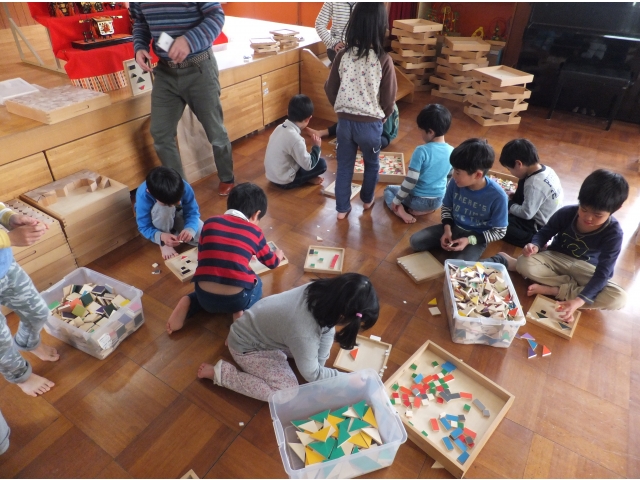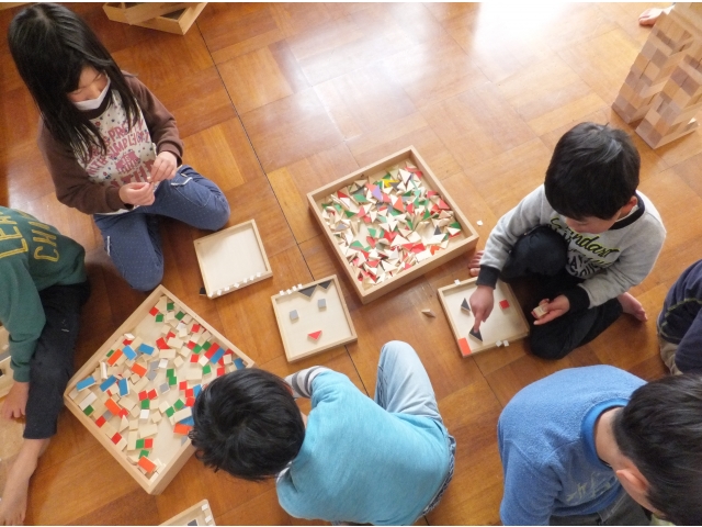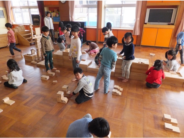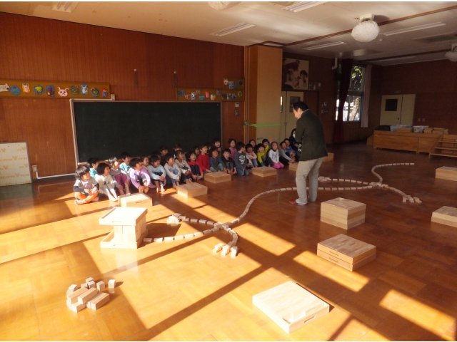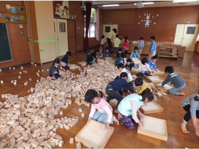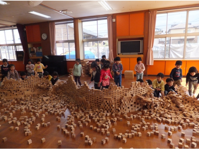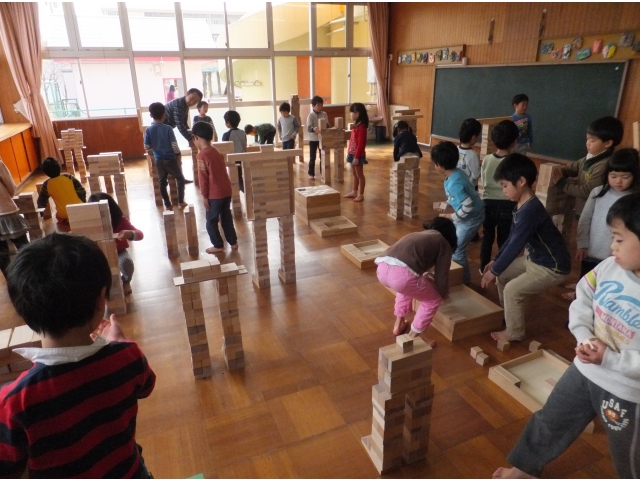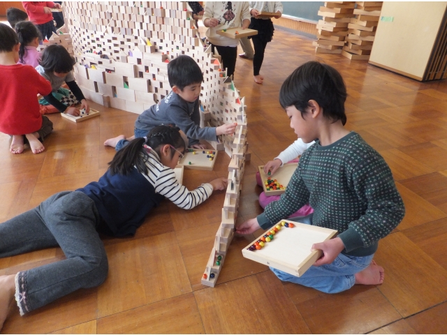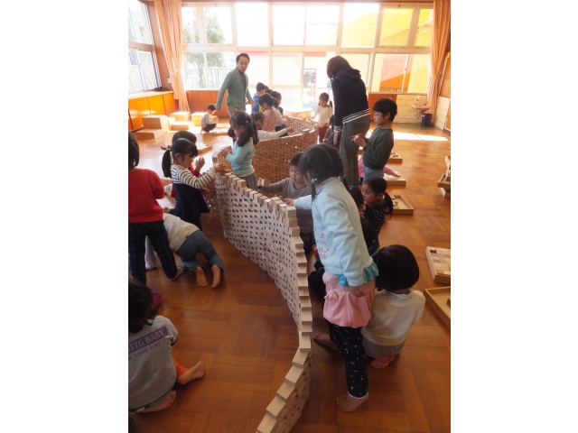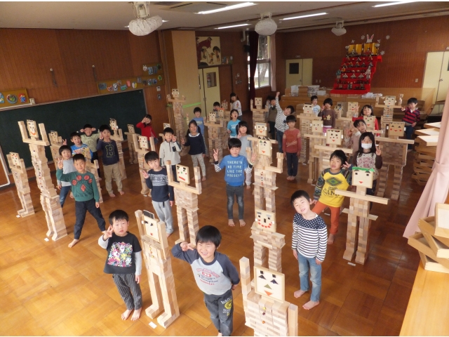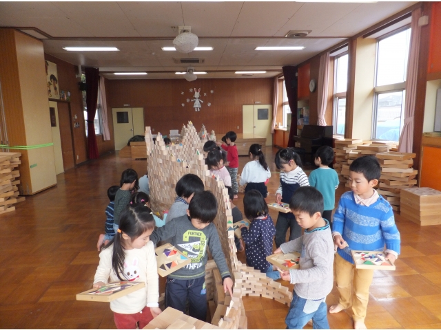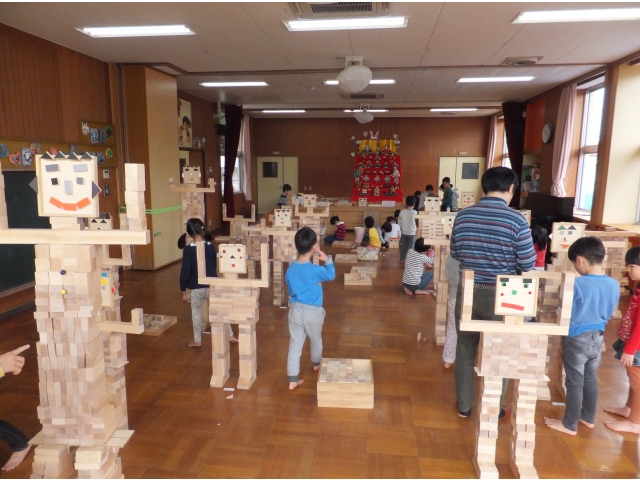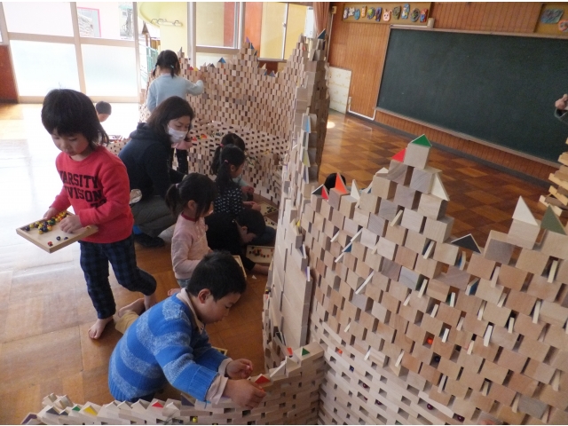 4歳児きりん組と、5歳児ぞう組がそれぞれ積み木ワークをし、展示しました(8分音符)