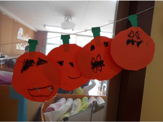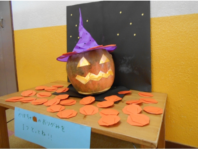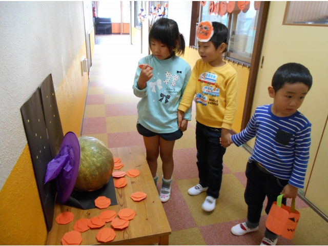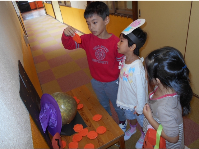 ぞう組を抜けると、廊下にある大きなかぼちゃに向かいます。そこにある折り紙のかぼちゃを取ると問題が書いてあり、3人で答えを考えます。
