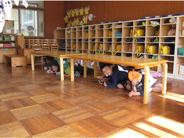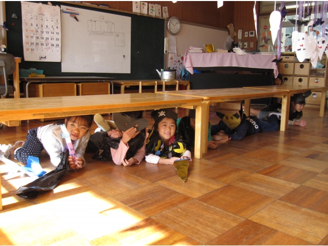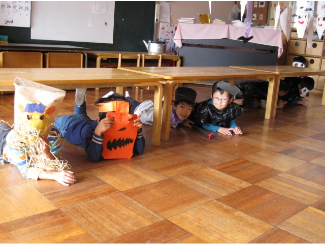 「隠れて驚かせよう」「みんなで固まるんじゃなくて、場所を決めて驚かせよう」と話し合って準備します。