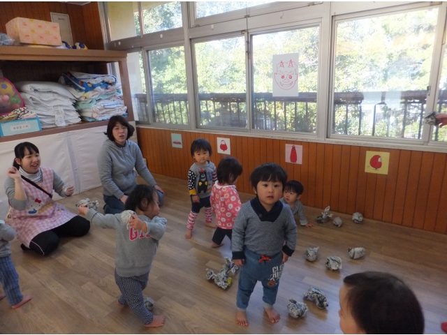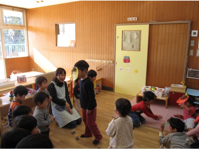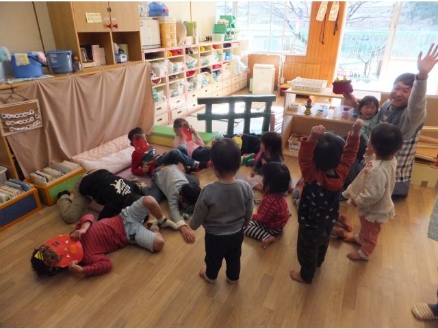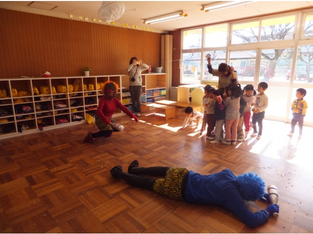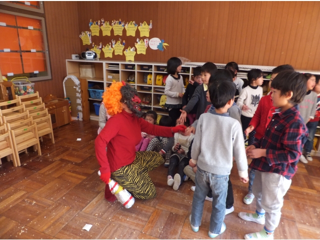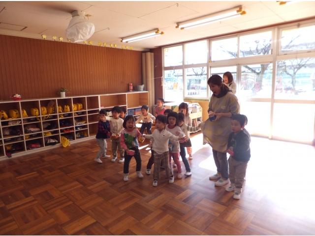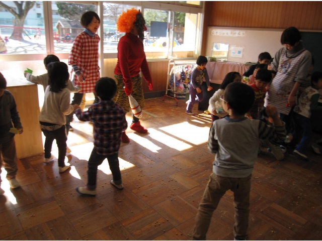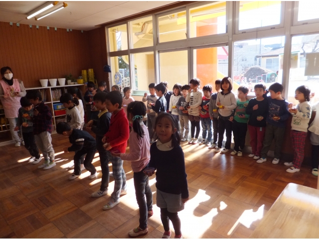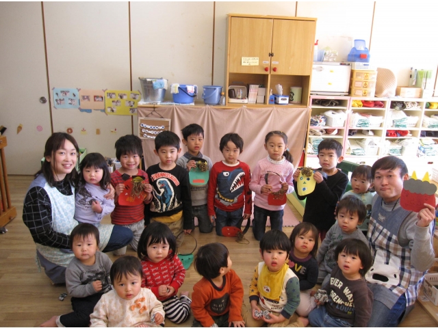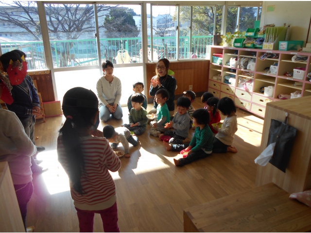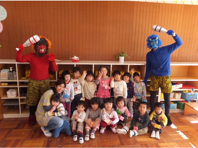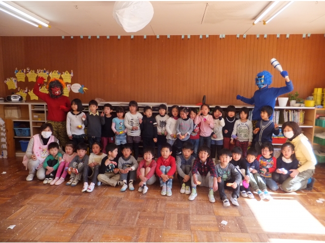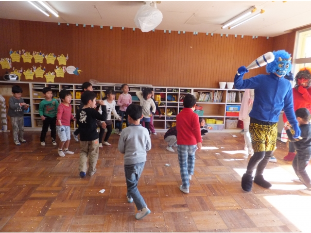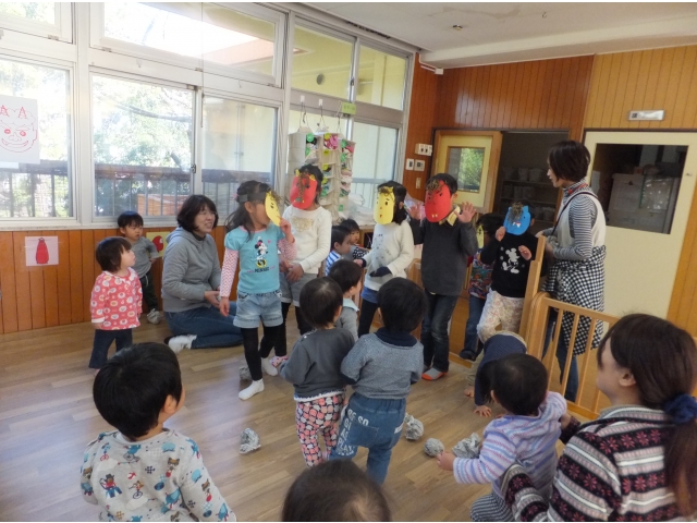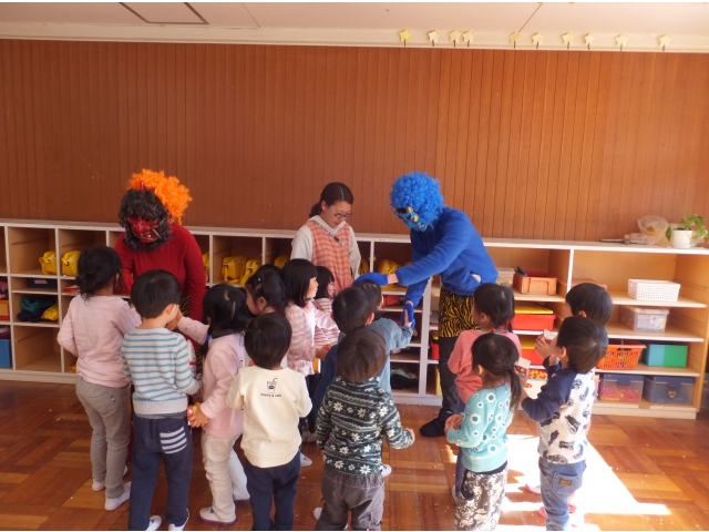 幼児組(3歳児~5歳児)はどんな鬼が来るのかな?自分の中の怒りん坊鬼、泣き虫鬼、いじわる鬼…も一緒に追い出せるかな?