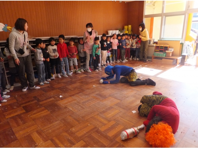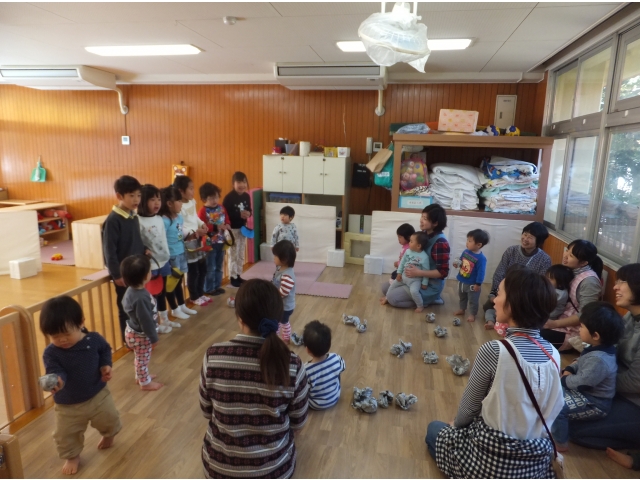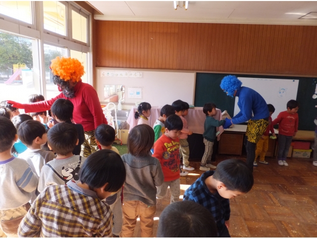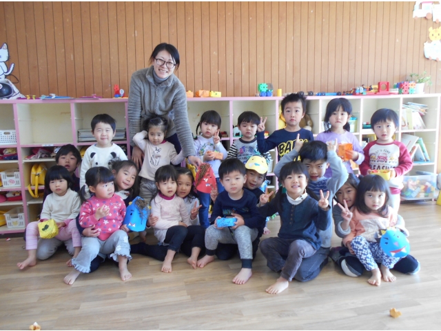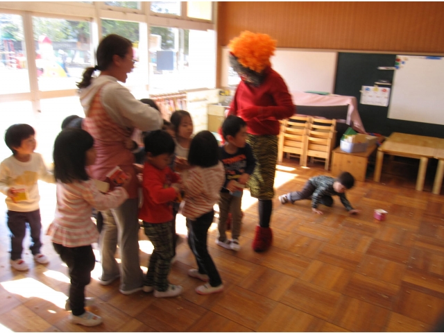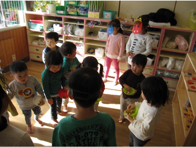 0歳児~2歳児クラスには、年長組さんが自分で作ったお面をかぶり登場!
