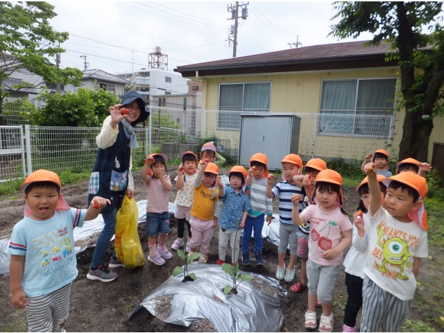 今日は、すずらん組(3歳児)が担任と一緒に畑に入りました。