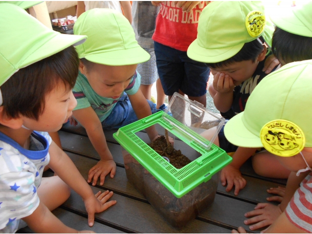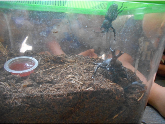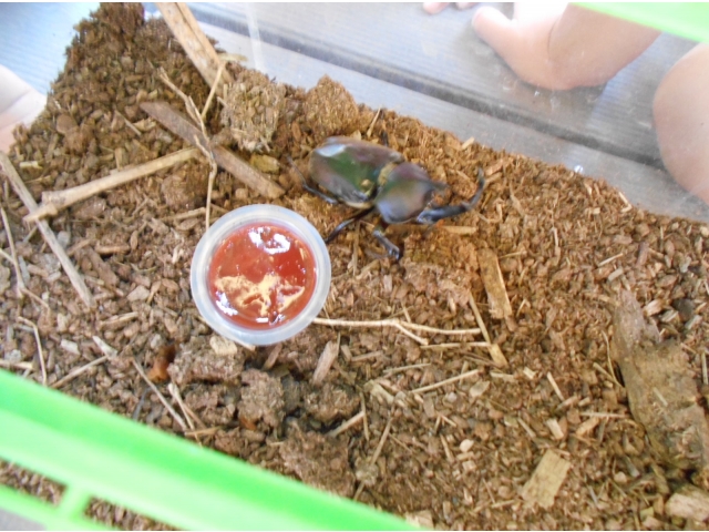 5歳児の部屋で育てていたカブトムシの幼虫がついに成虫になりました。土の中から出てきたカブトムシに大騒ぎ!頭をぶつけながら必死で見ています。