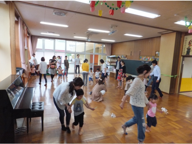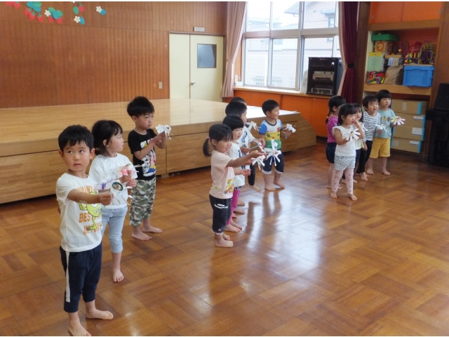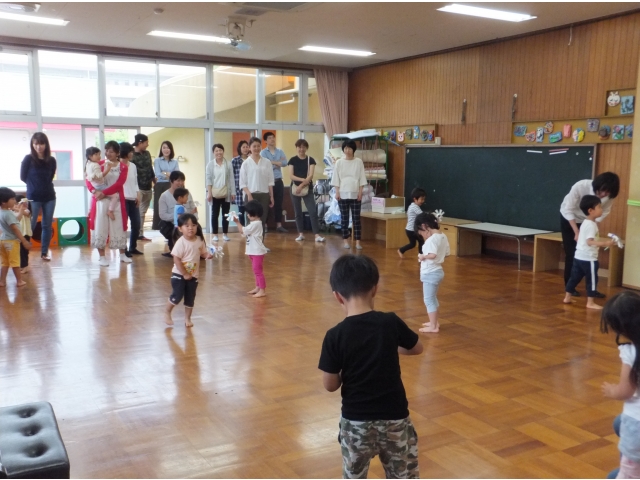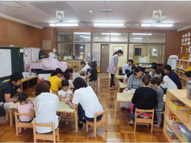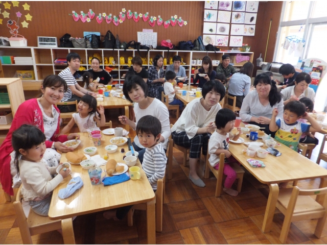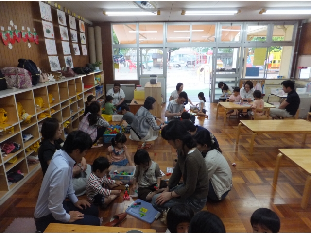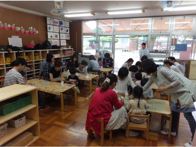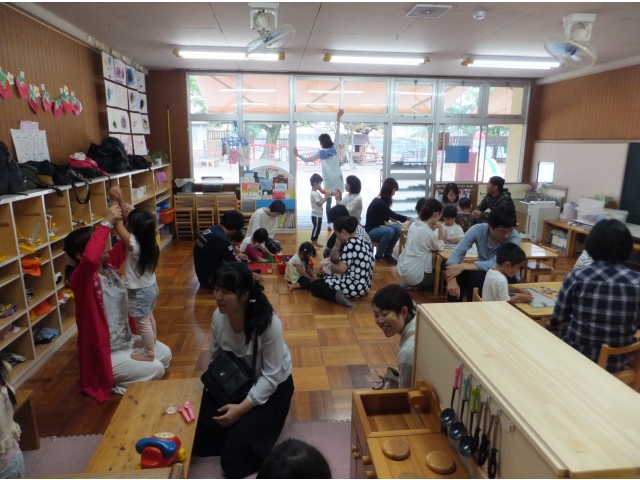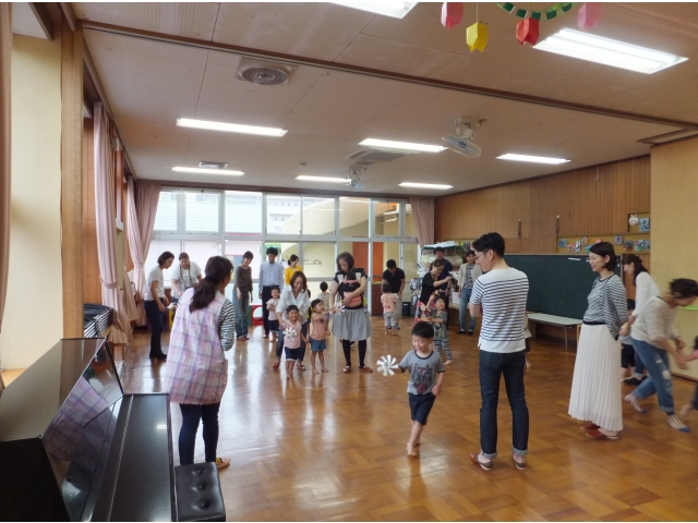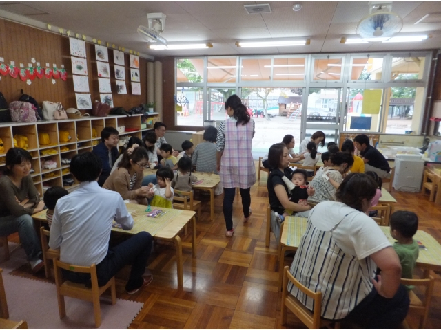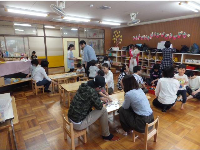 あいにくの雨でしたが、大好きなお父さん、お母さんと一緒に風車を作ったり、体操したり、部屋で好きな遊びをしたり、給食を食べたりし楽しいひとときを過ごしました。