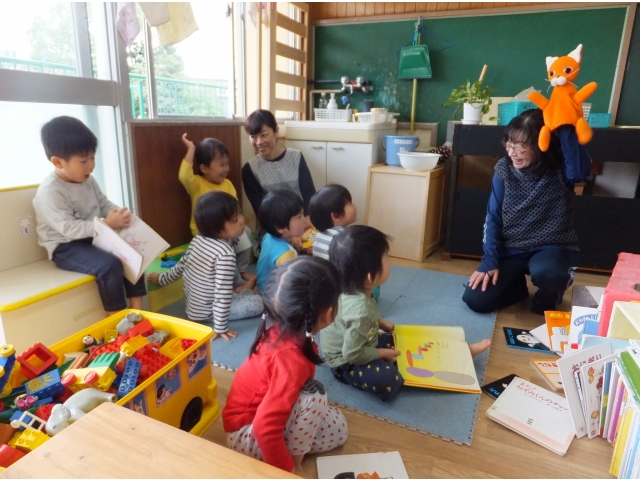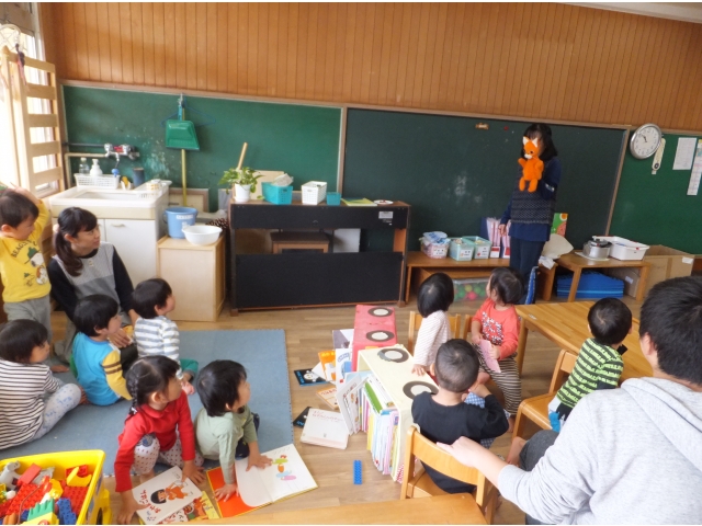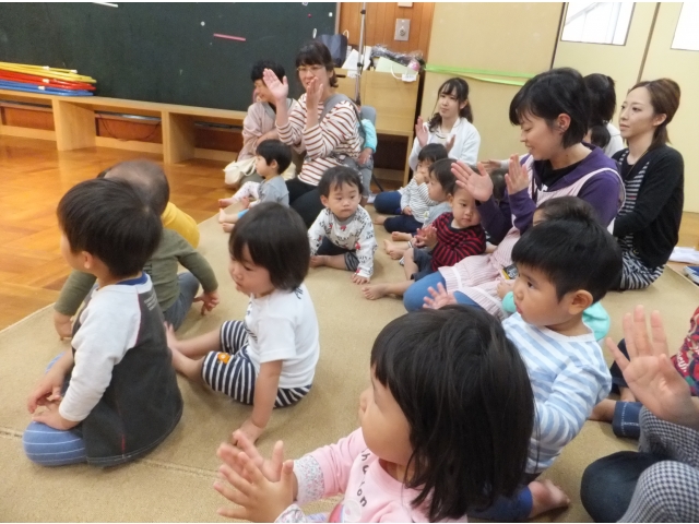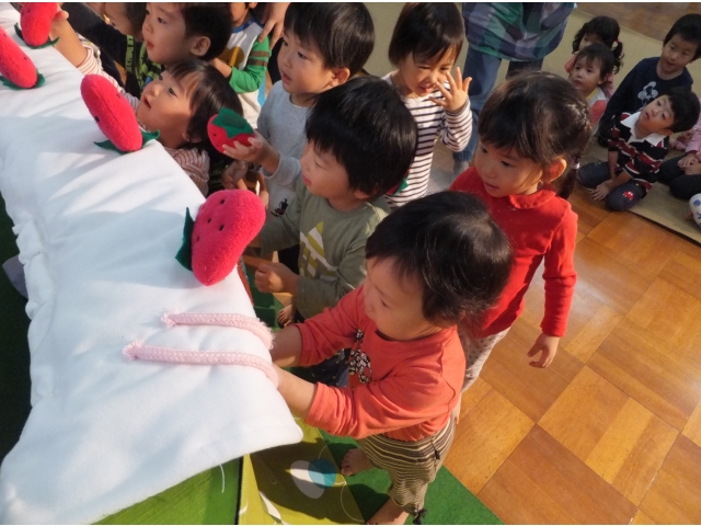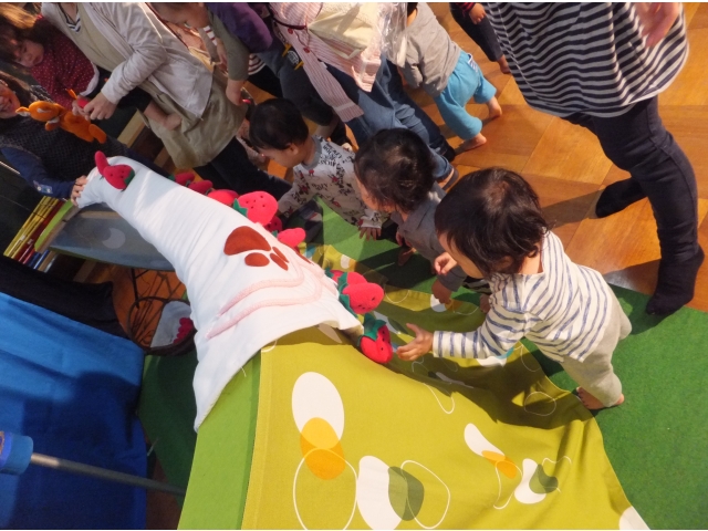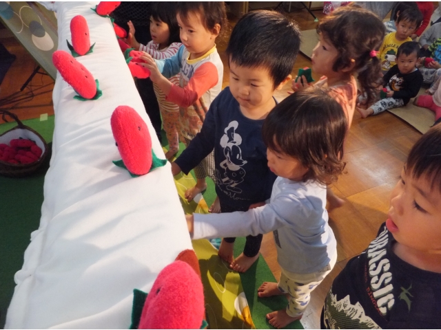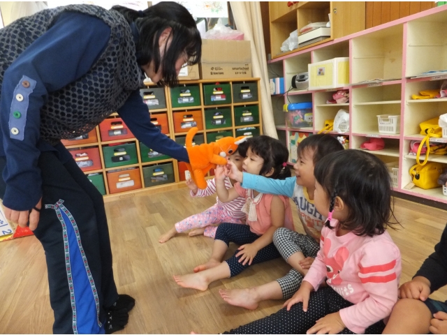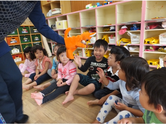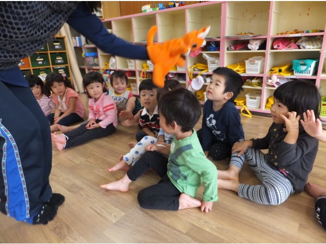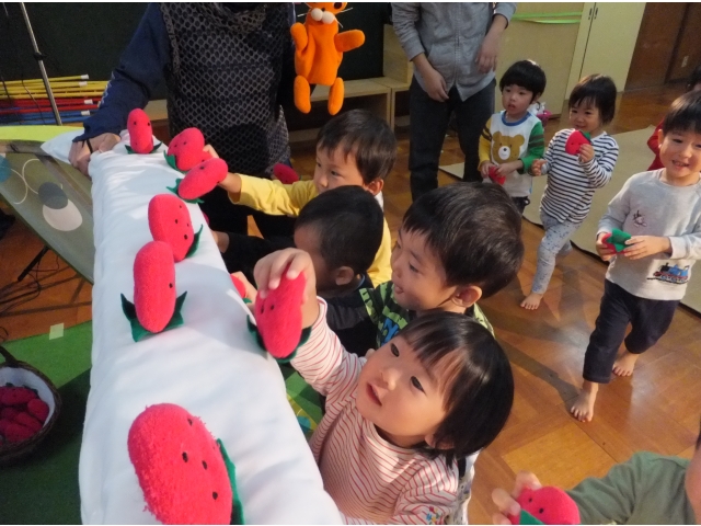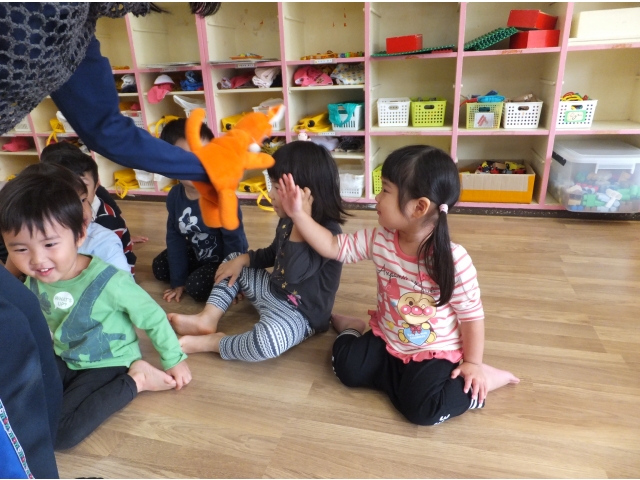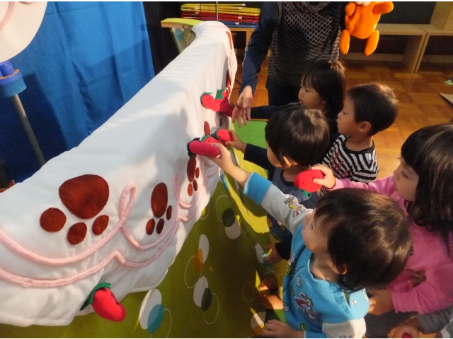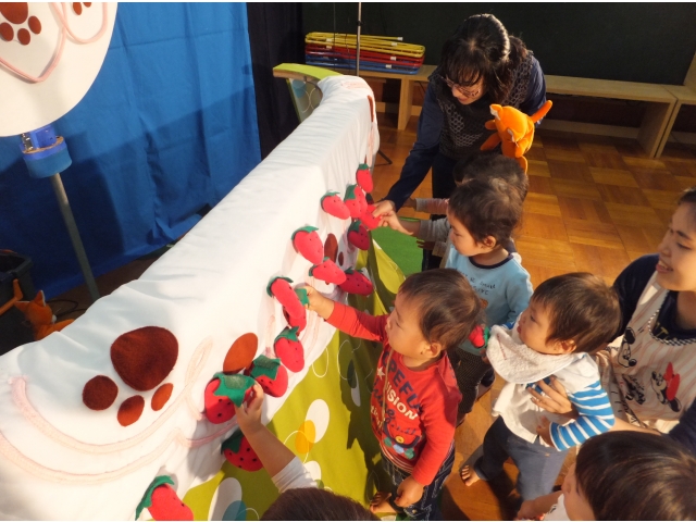 2歳児はストーリーをしっかり理解し、笑ったり、お話ししたり、手拍子したり、踊ったりと全身で楽しんでいました。担任と目を合わせて楽しみを共有する姿もありました。