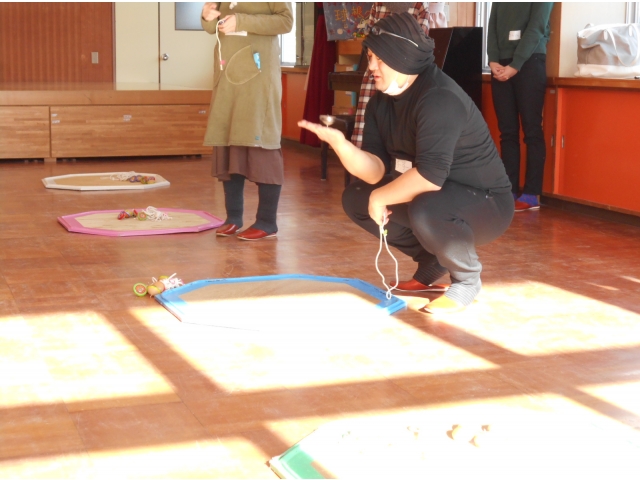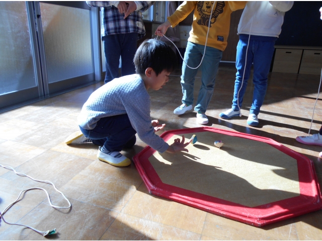 最後は5歳児。自分のこまを持ってきて教えてもらいます。回せる子が多かったので、手のせのコツを教えてもらいました。