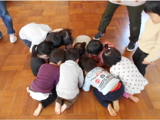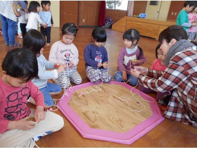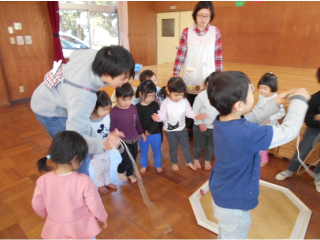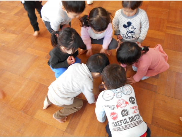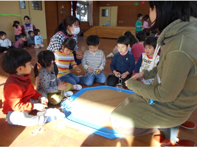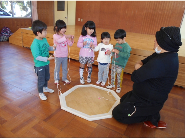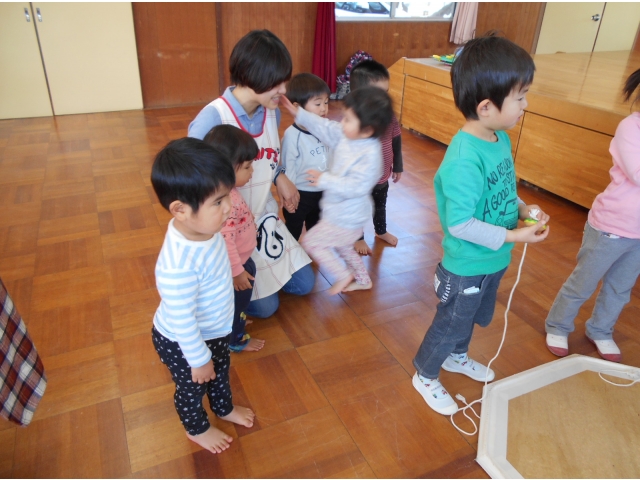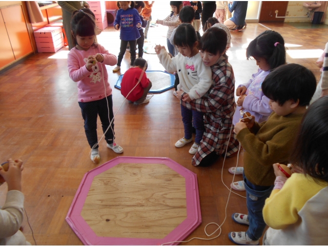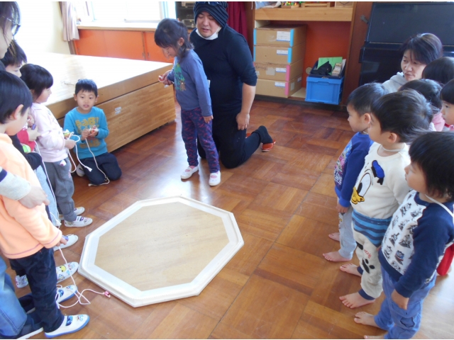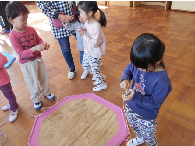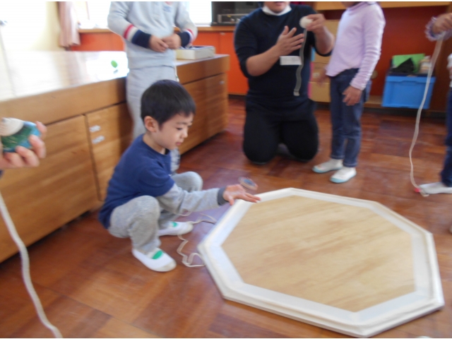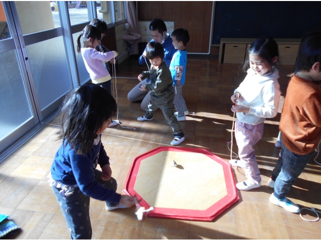 3歳児は自分でひもを巻くのが難しいので、巻いてもらったこまを一緒にまわしてみました。まわると喜びよりもびっくり顔の子が多く、かわいかったです。