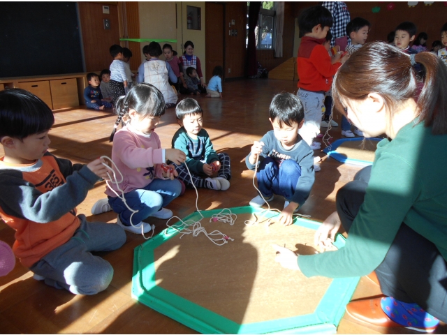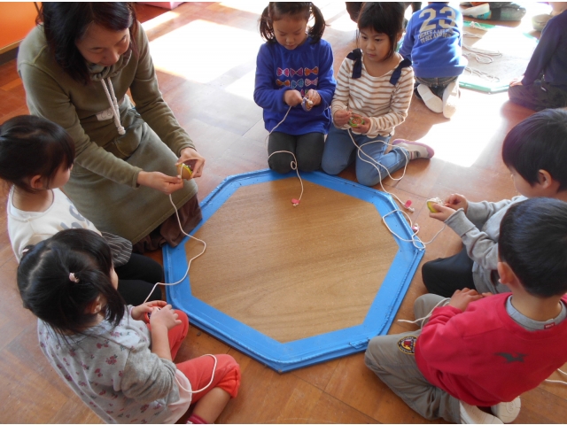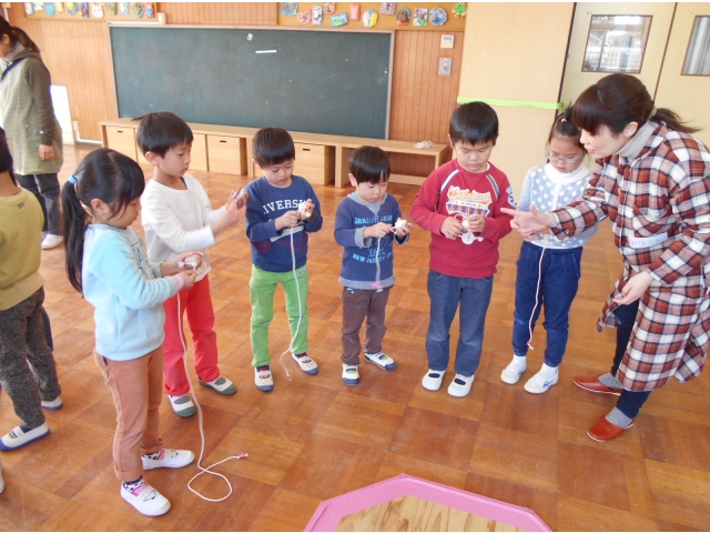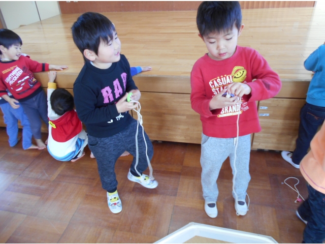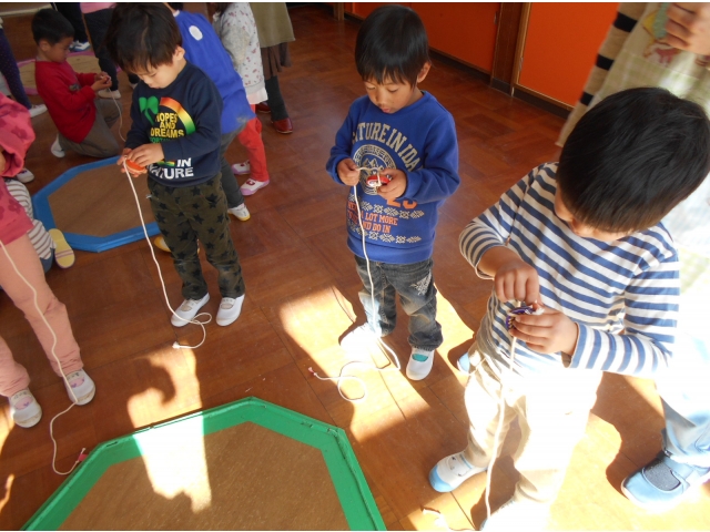 次は4歳児。4歳児は自分でひもを巻くことをがんばっていました。ひもを巻くことは難しかったけど、あきらめず挑戦します。こまがまわると飛び上がって喜ぶ子もいました。