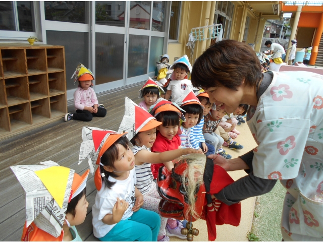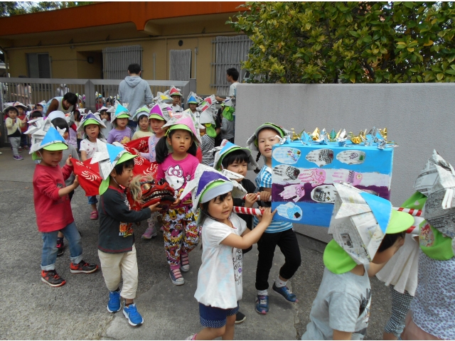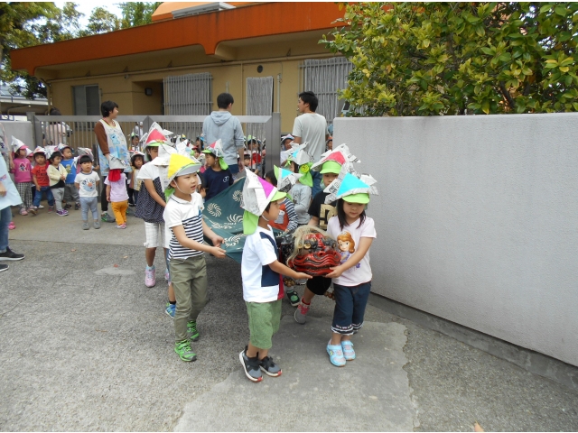 5歳児が作ったおみこしと、保育園にあるお獅子で保育園のまわりを1周してきます。