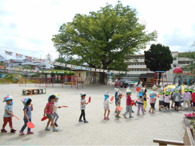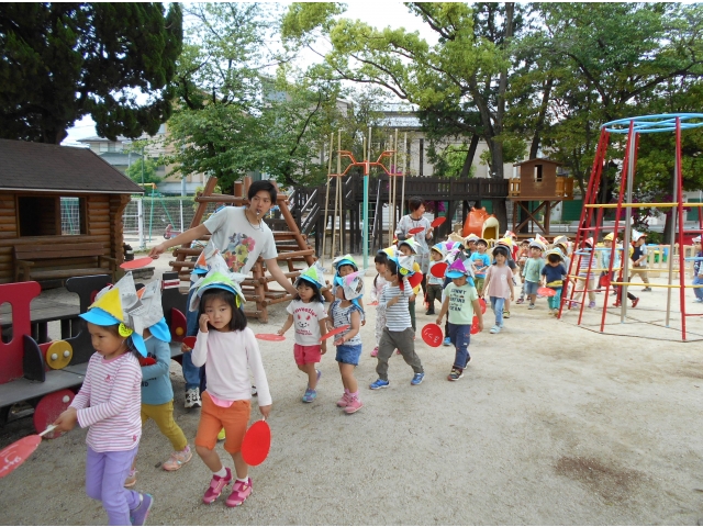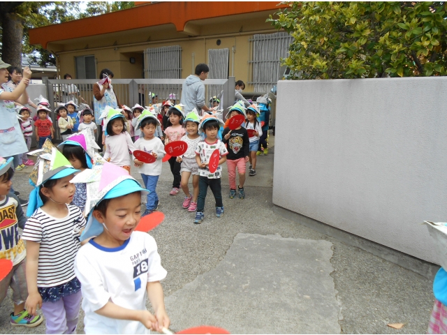 3~5歳児が作ったこいのぼりを園庭に泳がせて始まります。