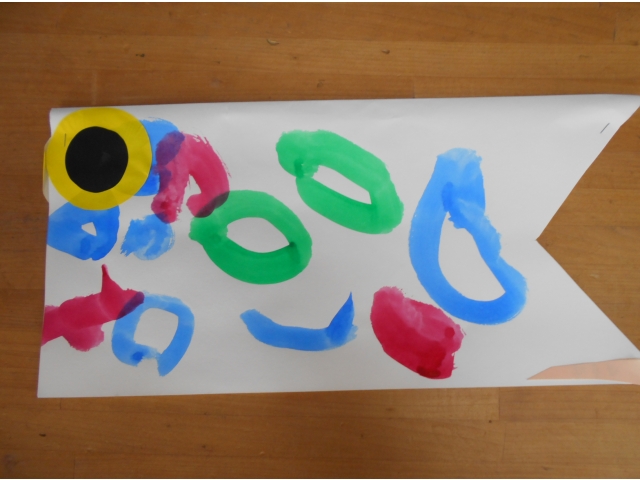 3歳児は、好きな色の絵の具でうろこの丸を描きました。