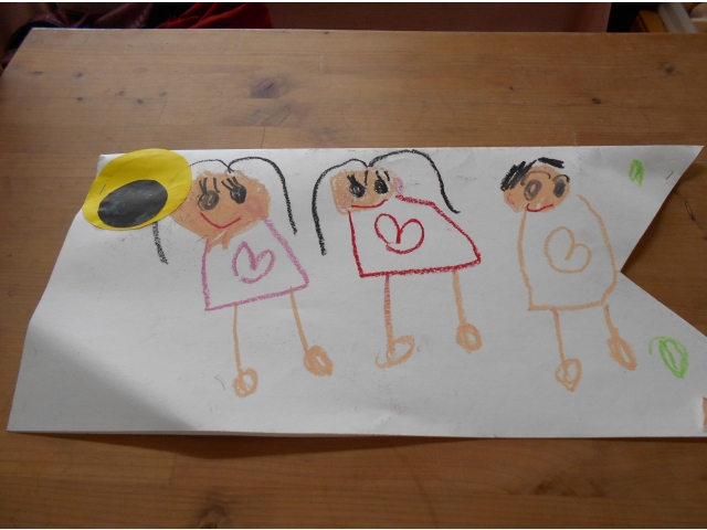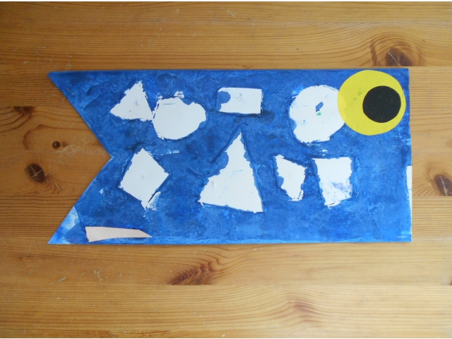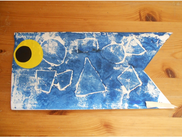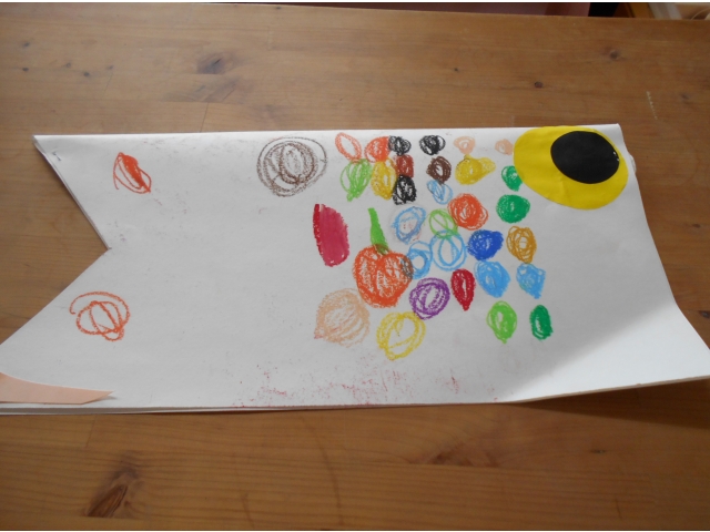 4歳児は、クレパスでうろこを描き、反対面は好きな絵を描きました。