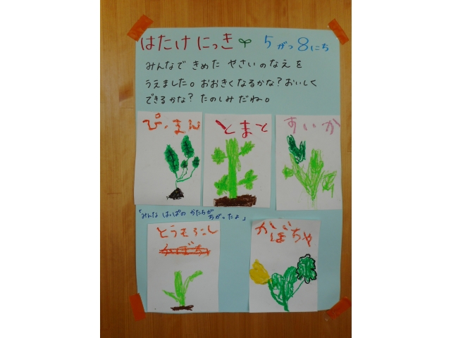 今年はみんなで話し合い、ピーマン、トマト、とうもろこし、すいか、かぼちゃを育てることに決まりました。