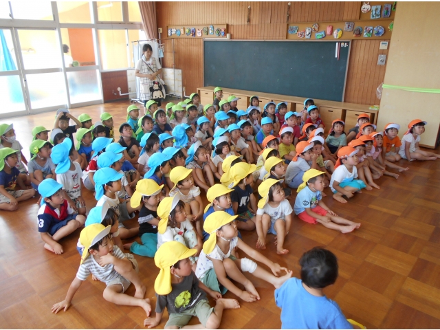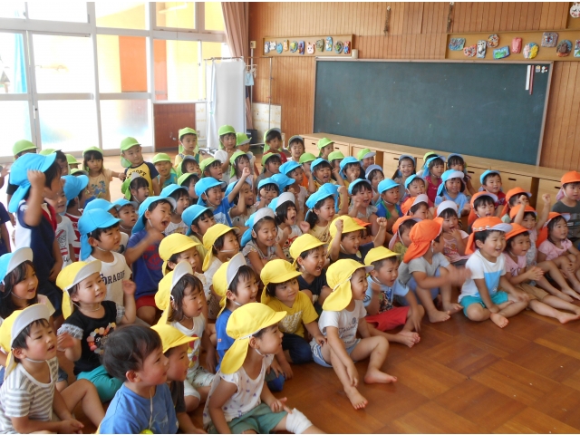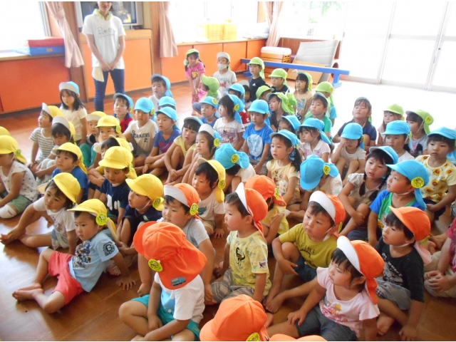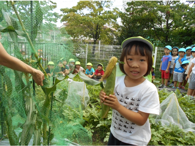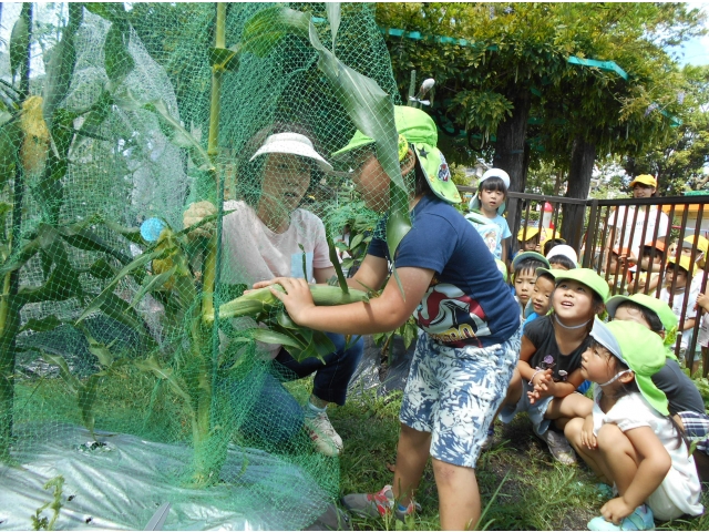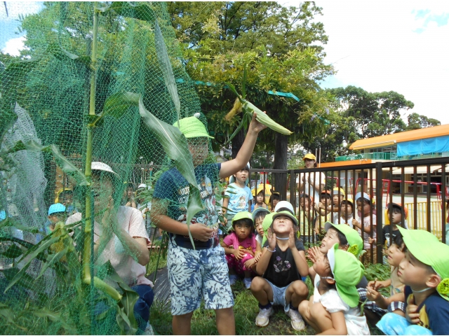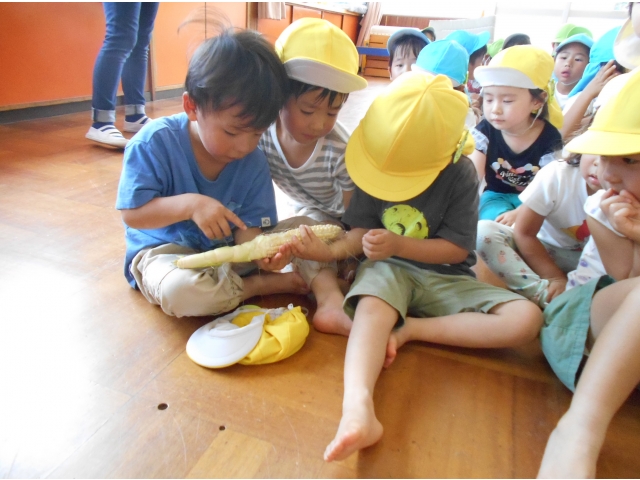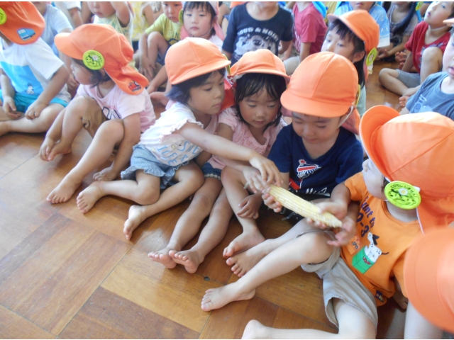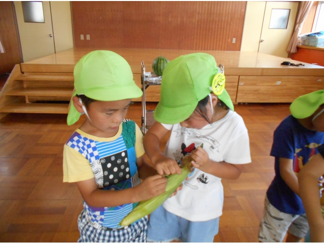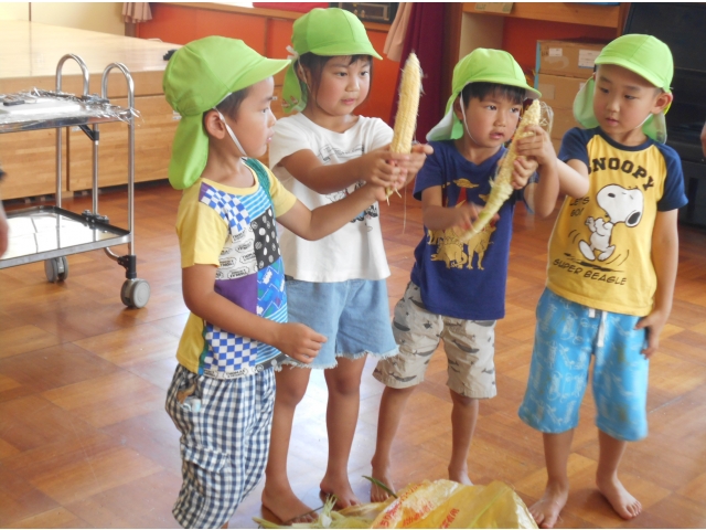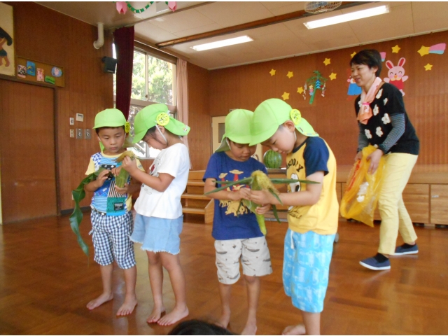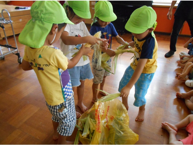 年長さんの代表者に、とうもろこしの皮をむいてもらいました。
