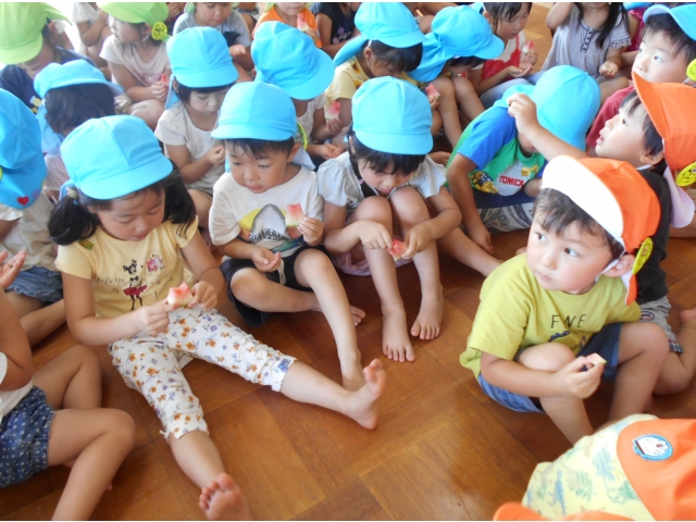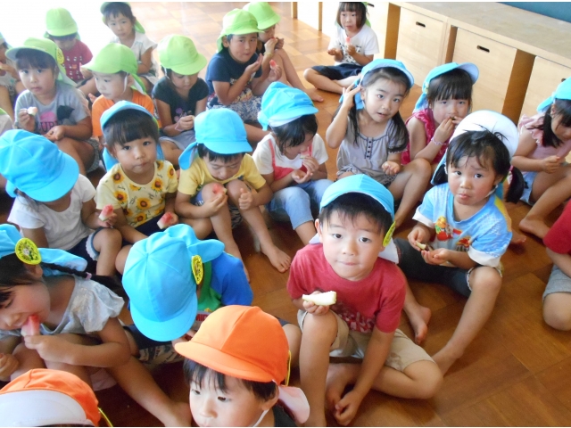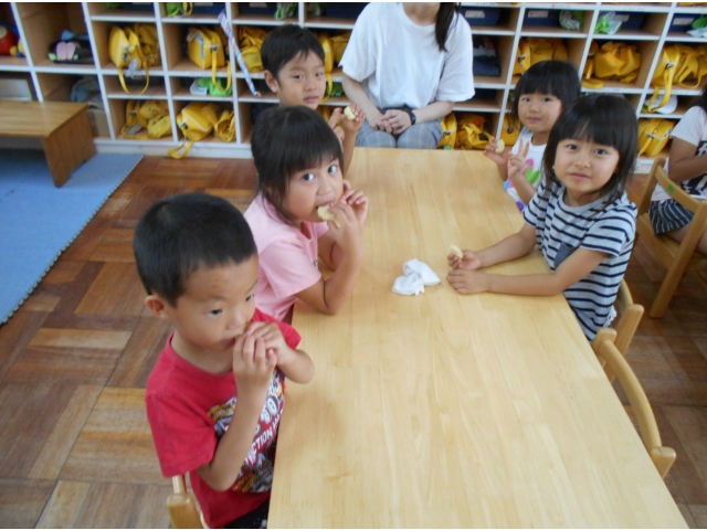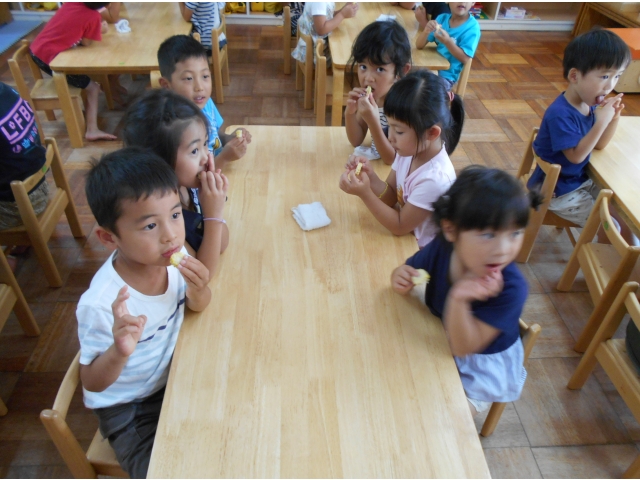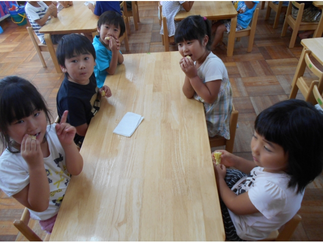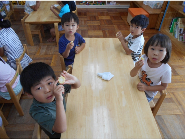 小さく切ったとうもろこしでしたが、「いいにおい!」「とうもろこしの味がする」「色はうすい」「甘いねー」と感想を言いながらあっという間に食べてしまいました。