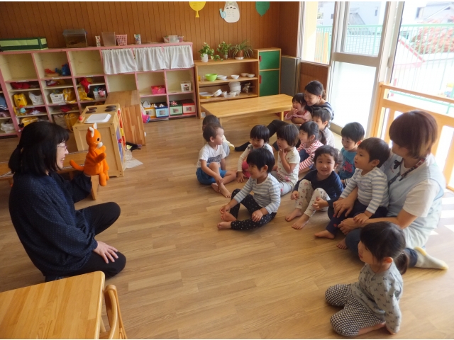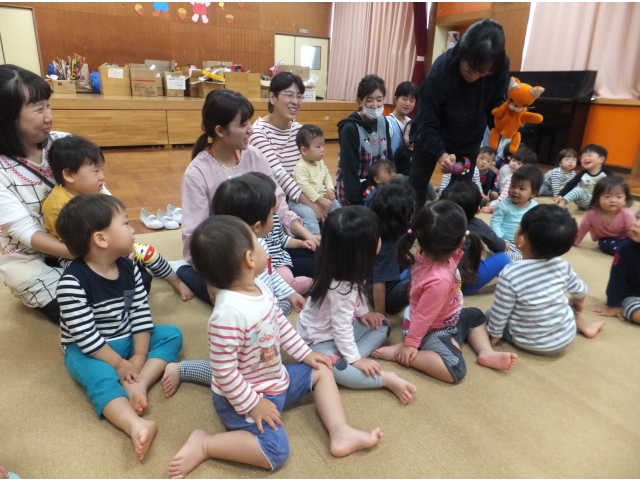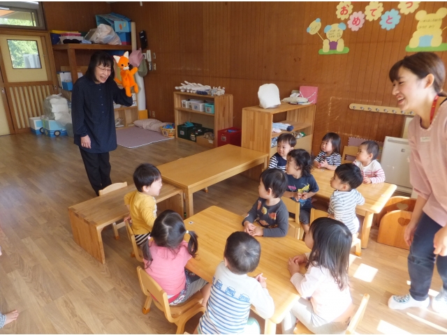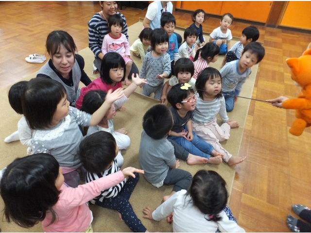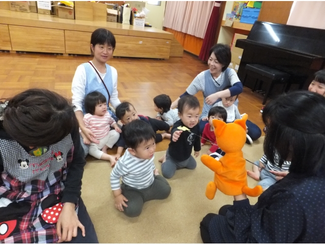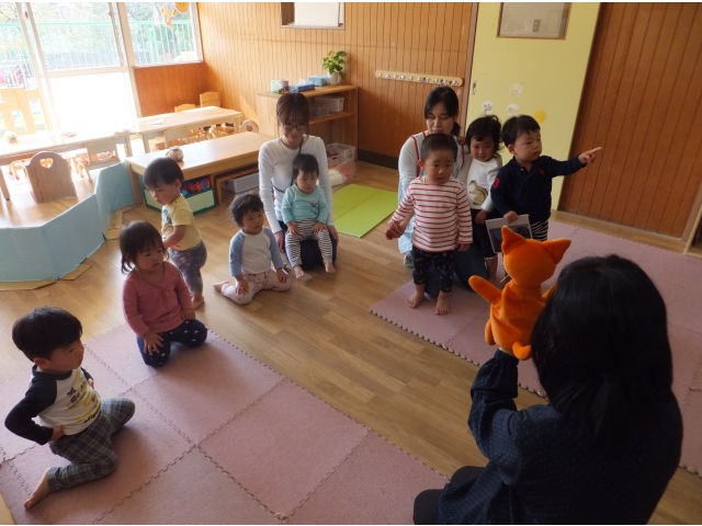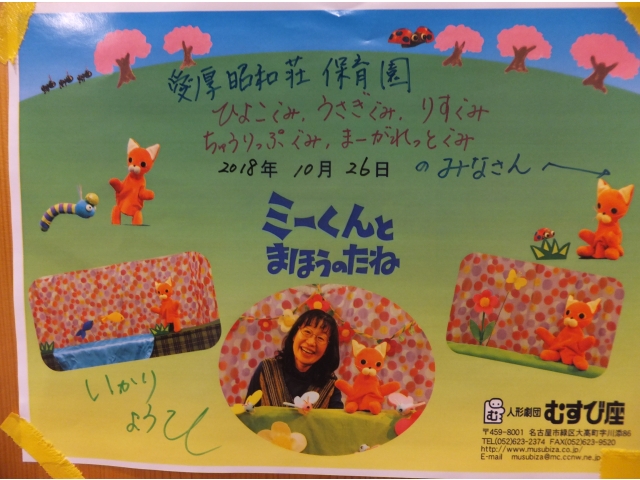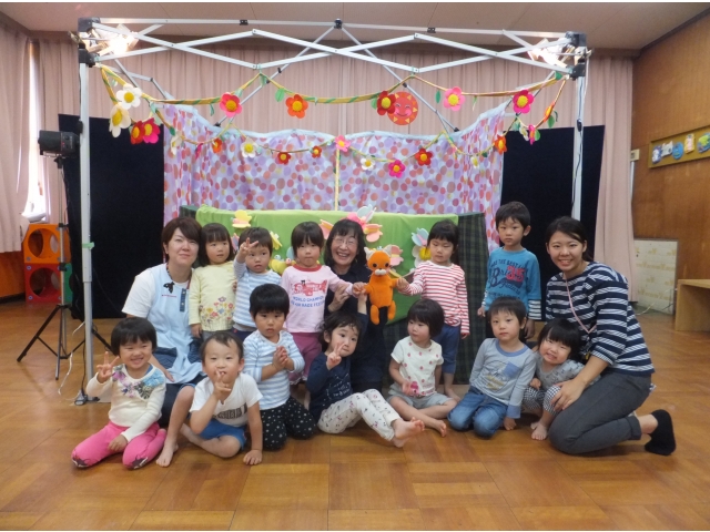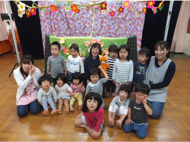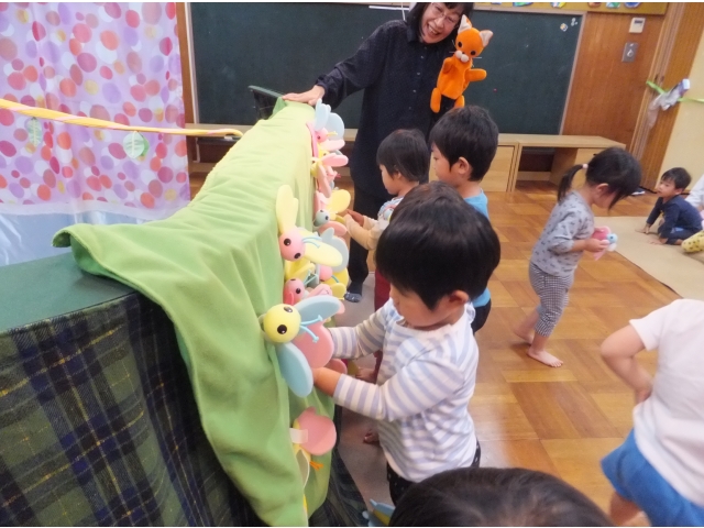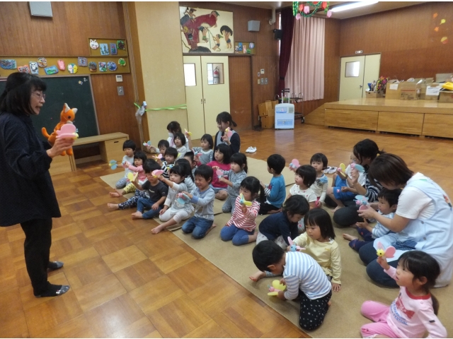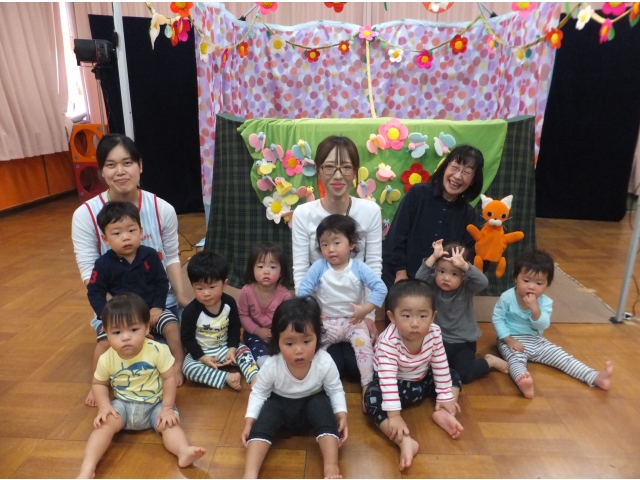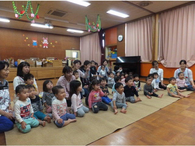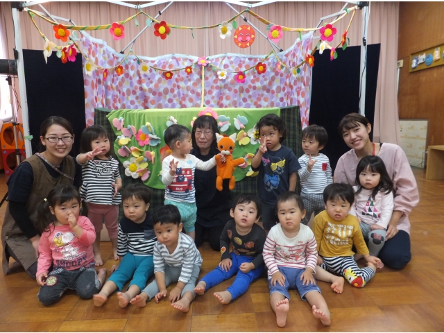 10月26日、保護者会が主催してくださった人形劇団むすび座の『ミーくんとまほうのたね』を乳児クラスの子どもたちが鑑賞しました。