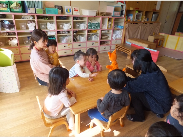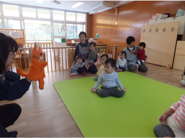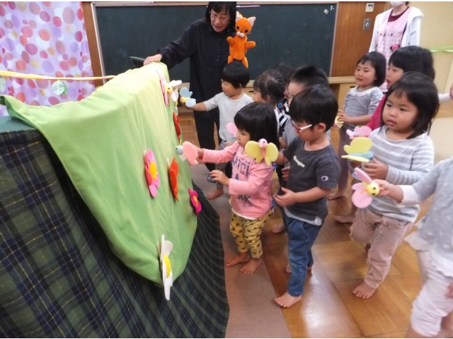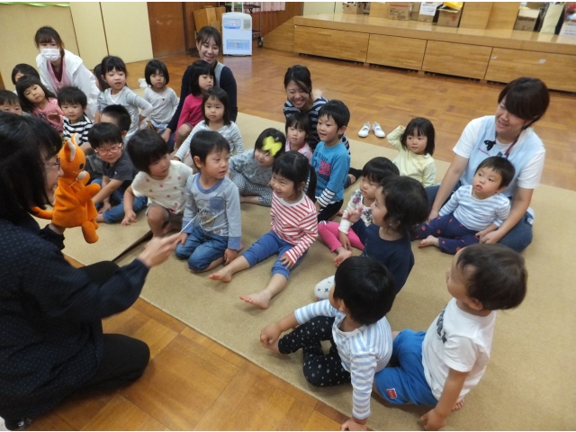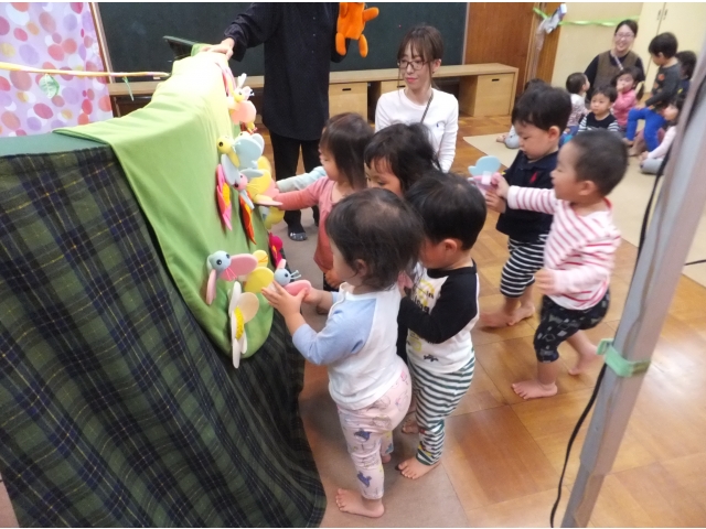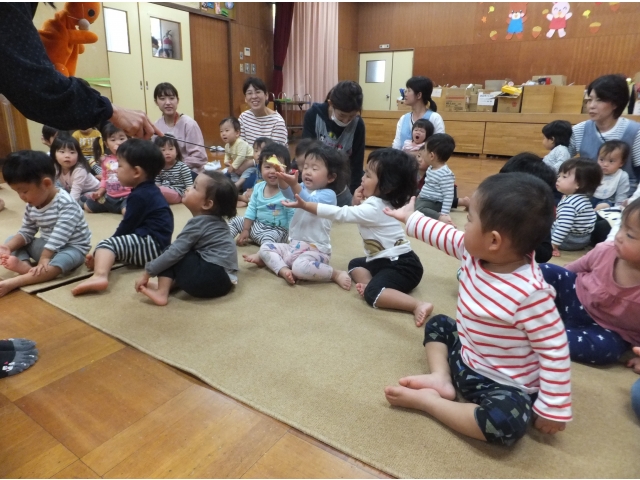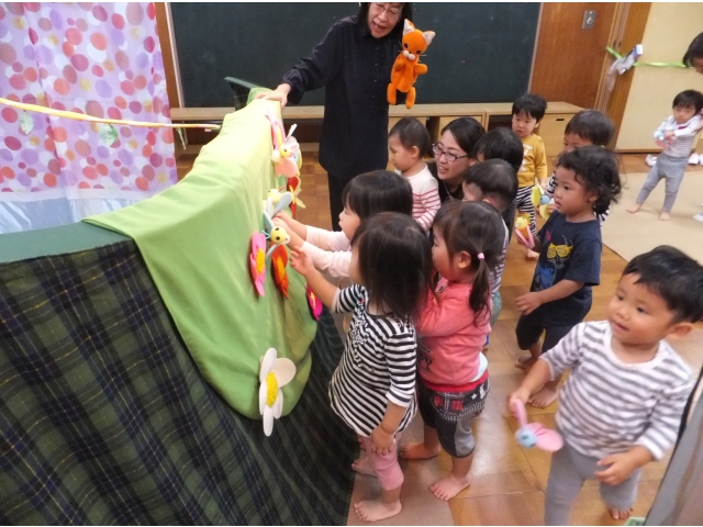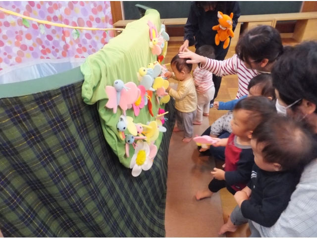 0・1歳児の子どもたちもとても集中して観ることができました。指差ししたり、笑ったり、どんどん舞台に近付いたり、ちょっぴり怖くて先生にくっつきながら観たりとそれぞれの姿がありました。