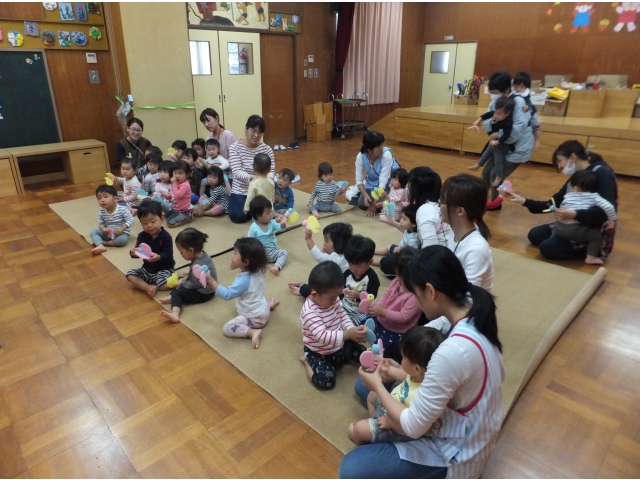 0・1歳児の子どもたちが遊戯室に集まりました。