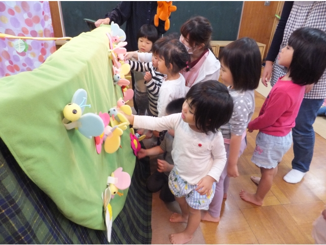 2歳児さんも、たくさんのちょうちょにびっくり!どれにしようか迷いながら自分のちょうちょを見つけました。自分でお花畑にぺったんとくっつけてあげました。