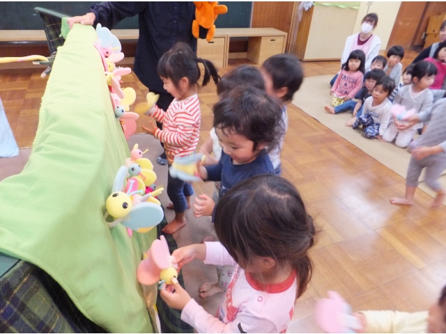2歳児さんはストーリーがわかっていて、ミーくんと一緒にドキドキしながらお話の世界を楽しんでいました。