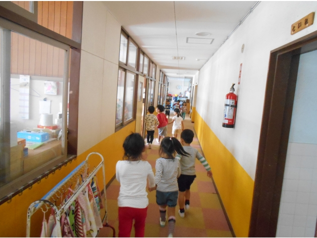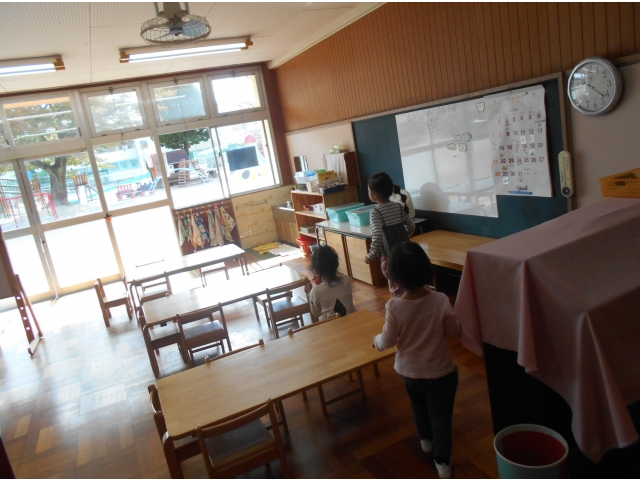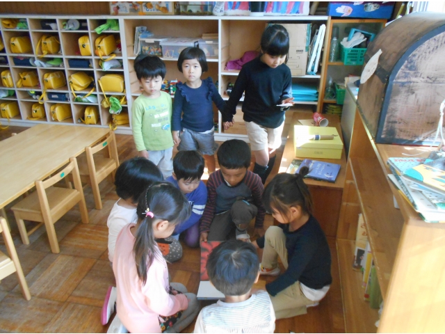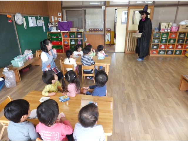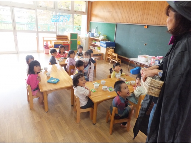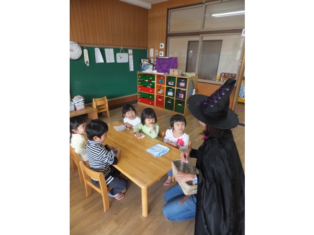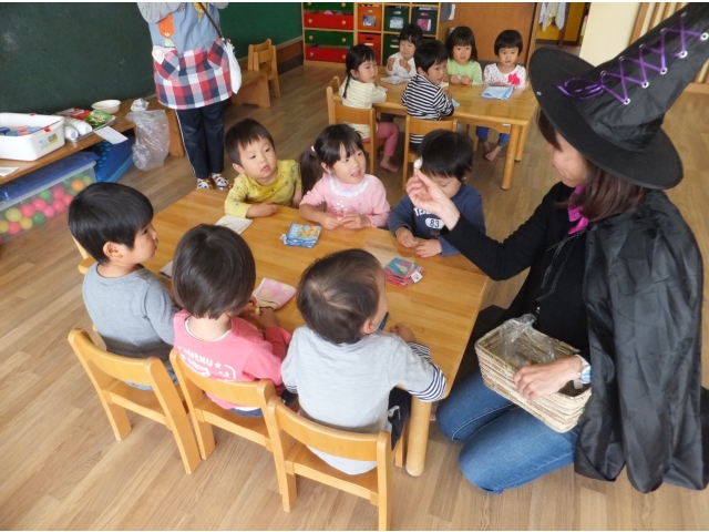 幼児クラスの子どもたちは、力を合わせてお菓子をゲットしなければなりません。まずは3・4・5歳児が3人1組になって、いろんな部屋に隠してあるかぼちゃの折り紙を探します。裏に問題が書いてあるので答えを3人で考えます。答えがわかったら、魔女の所へ行きます。正解すればラムネをもらえますが、不正解の時はやり直しです。さあ、スタートです。