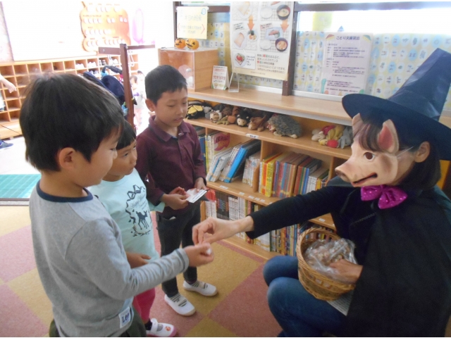 びっくりしながらも「おかしをくれないといたずらするぞー。ガオー!」と魔女を驚かせ、見事ラムネをゲットしました。